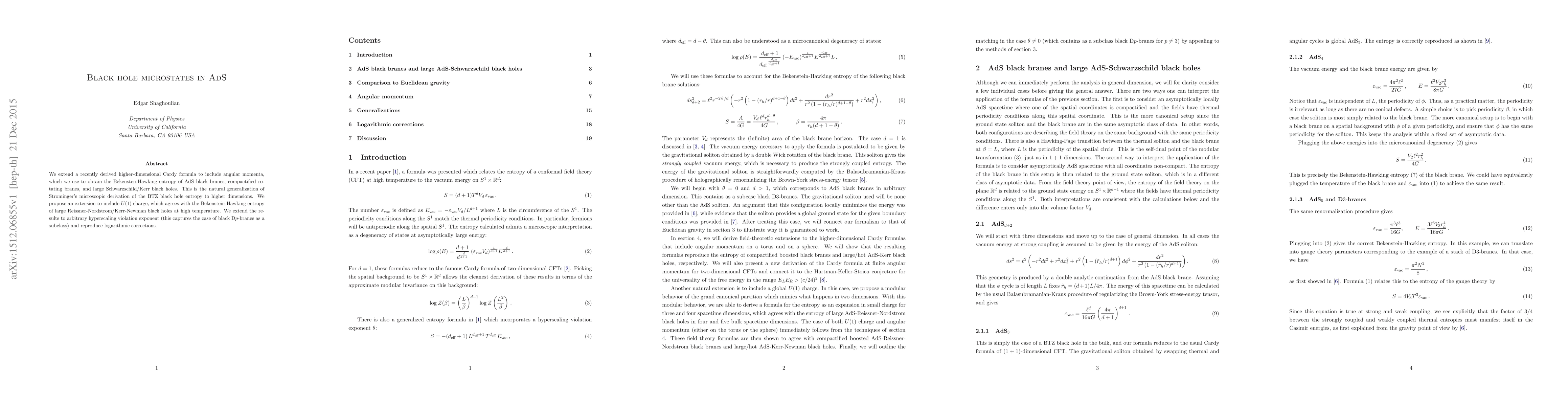 We extend a recently derived higher-dimensional Cardy formula to include angular momenta, which we use to obtain the Bekensten-Hawking entropy of AdS black branes, compactified rotating branes, and large Schwarzschild/Kerr black holes. This is the natural generalization of Strominger's microscopic derivation of the BTZ black hole entropy to higher dimensions. We propose an extension to include $U(1)$ charge, which agrees with the Bekenstein-Hawking entropy of large Reissner-Nordstrom/Kerr-Newman black holes at high temperature. We extend the results to arbitrary hyperscaling violation exponent (this captures the case of black D$p$-branes as a subclass) and reproduce logarithmic corrections.