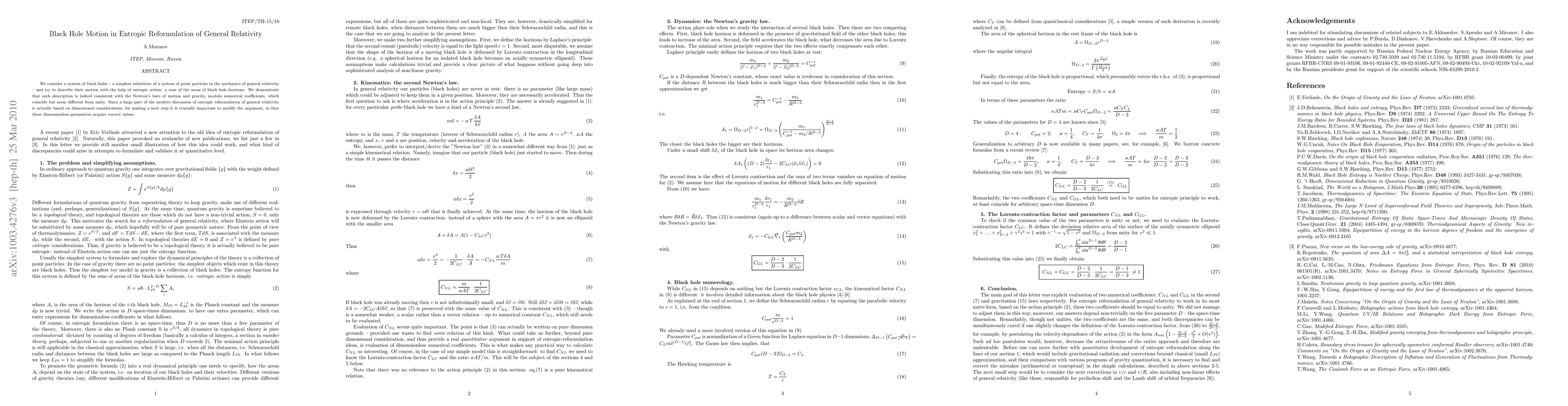 This paper explores the motion of black holes using an entropic action, showing consistency with Newtonian laws of motion and gravity, albeit with non-unity numerical coefficients. It emphasizes the need for adjusting dimensionless parameters to align with modern theoretical frameworks in entropic reformulations of general relativity.