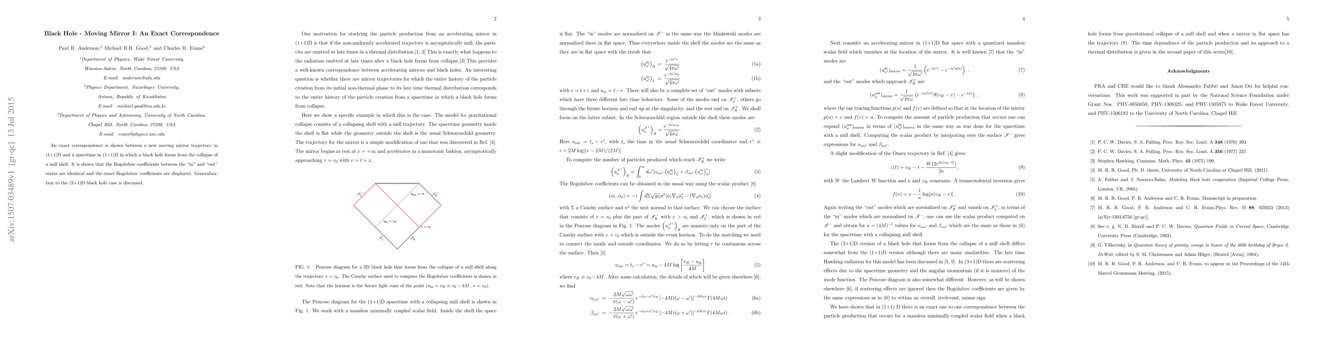 This paper establishes an exact correspondence between a moving mirror in (1+1)D and a (1+1)D black hole spacetime formed by collapsing null shells, showing identical Bogolubov coefficients for "in" and "out" states, with implications for generalization to (3+1)D black holes.