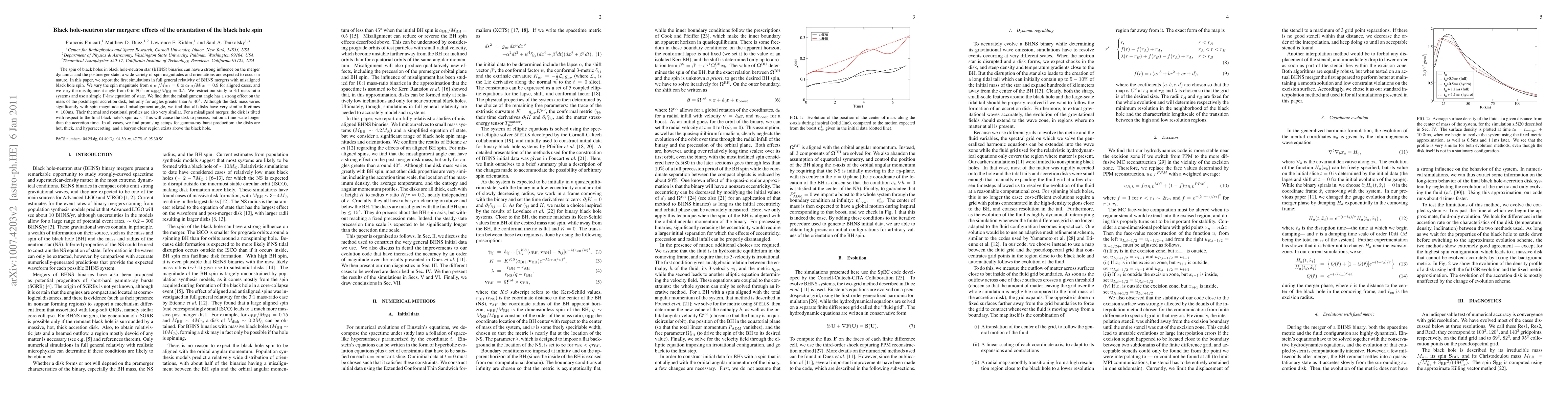 The spin of black holes in black hole-neutron star (BHNS) binaries can have a strong influence on the merger dynamics and the postmerger state; a wide variety of spin magnitudes and orientations are expected to occur in nature. In this paper, we report the first simulations in full general relativity of BHNS mergers with misaligned black hole spin. We vary the spin magnitude from a/m=0 to a/m=0.9 for aligned cases, and we vary the misalignment angle from 0 to 80 degrees for a/m=0.5. We restrict our study to 3:1 mass ratio systems and use a simple Gamma-law equation of state. We find that the misalignment angle has a strong effect on the mass of the postmerger accretion disk, but only for angles greater than ~ 40 degrees. Although the disk mass varies significantly with spin magnitude and misalignment angle, we find that all disks have very similar lifetimes ~ 100ms. Their thermal and rotational profiles are also very similar. For a misaligned merger, the disk is tilted with respect to the final black hole's spin axis. This will cause the disk to precess, but on a timescale longer than the accretion time. In all cases, we find promising setups for gamma-ray burst production: the disks are hot, thick, and hyperaccreting, and a baryon-clear region exists above the black hole.