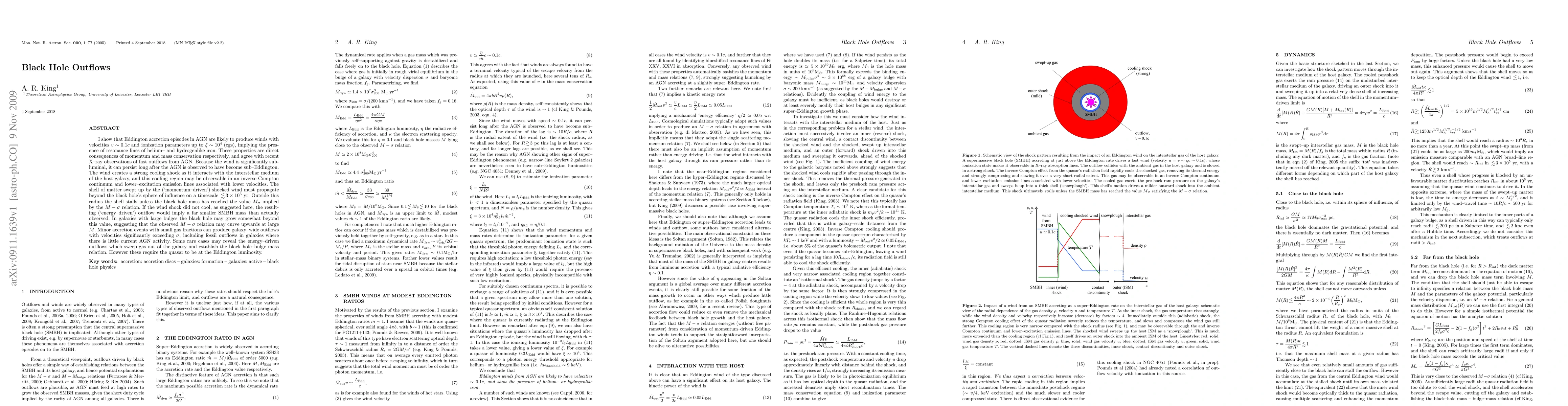 I show that Eddington accretion episodes in AGN are likely to produce winds with velocities $v \sim 0.1c$ and ionization parameters up to $\xi \sim 10^4$ (cgs), implying the presence of resonance lines of helium-- and hydrogenlike iron. These properties are direct consequences of momentum and mass conservation respectively, and agree with recent X-ray observations of fast outflows from AGN. Because the wind is significantly subluminal, it can persist long after the AGN is observed to have become sub--Eddington. The wind creates a strong cooling shock as it interacts with the interstellar medium of the host galaxy, and this cooling region may be observable in an inverse Compton continuum and lower--excitation emission lines associated with lower velocities. The shell of matter swept up by the (`momentum--driven') shocked wind must propagate beyond the black hole's sphere of influence on a timescale $\la 3\times 10^5$ yr. Outside this radius the shell stalls unless the black hole mass has reached the value $M_{\sigma}$ implied by the $M - \sigma$ relation. If the wind shock did not cool, as suggested here, the resulting (`energy--driven') outflow would imply a far smaller SMBH mass than actually observed. In galaxies with large bulges the black hole may grow somewhat beyond this value, suggesting that the observed $M -\sigma$ relation may curve upwards at large $M$. Minor accretion events with small gas fractions can produce galaxy--wide outflows with velocities significantly exceeding $\sigma$, including fossil outflows in galaxies where there is little current AGN activity. Some rare cases may reveal the energy--driven outflows which sweep gas out of the galaxy and establish the black hole--bulge mass relation. However these require the quasar to be at the Eddington luminosity.