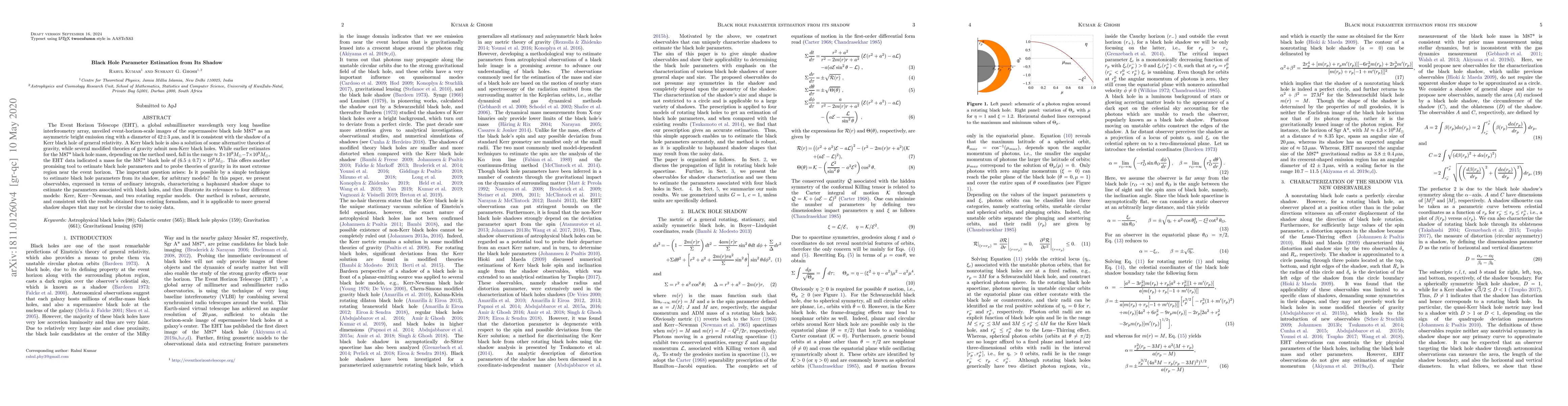 The Event Horizon Telescope (EHT), a global submillimeter wavelength very long baseline interferometry array, unveiled event-horizon-scale images of the supermassive black hole M87* as an asymmetric bright emission ring with a diameter of $ 42 \pm 3\; \mu$as, and it is consistent with the shadow of a Kerr black hole of general relativity. A Kerr black hole is also a solution of some alternative theories of gravity, while several modified theories of gravity admit non-Kerr black holes. While earlier estimates for the M87* black hole mass, depending on the method used, fall in the range $ \approx 3\times 10^9 M_\odot- 7 \times 10^9 $$ M_\odot $, the EHT data indicated a mass for the M87* black hole of $(6.5 \pm 0.7) \times 10^9 M_\odot $. This offers another promising tool to estimate black hole parameters and to probe theories of gravity in its most extreme region near the event horizon. The important question arises: Is it possible by a simple technique to estimate black hole parameters from its shadow, for arbitrary models? In this paper, we present observables, expressed in terms of ordinary integrals, characterizing a haphazard shadow shape to estimate the parameters associated with black holes, and then illustrate its relevance to four different models: Kerr, Kerr$-$Newman, and two rotating regular models. Our method is robust, accurate, and consistent with the results obtained from existing formalism, and it is applicable to more general shadow shapes that may not be circular due to noisy data.
