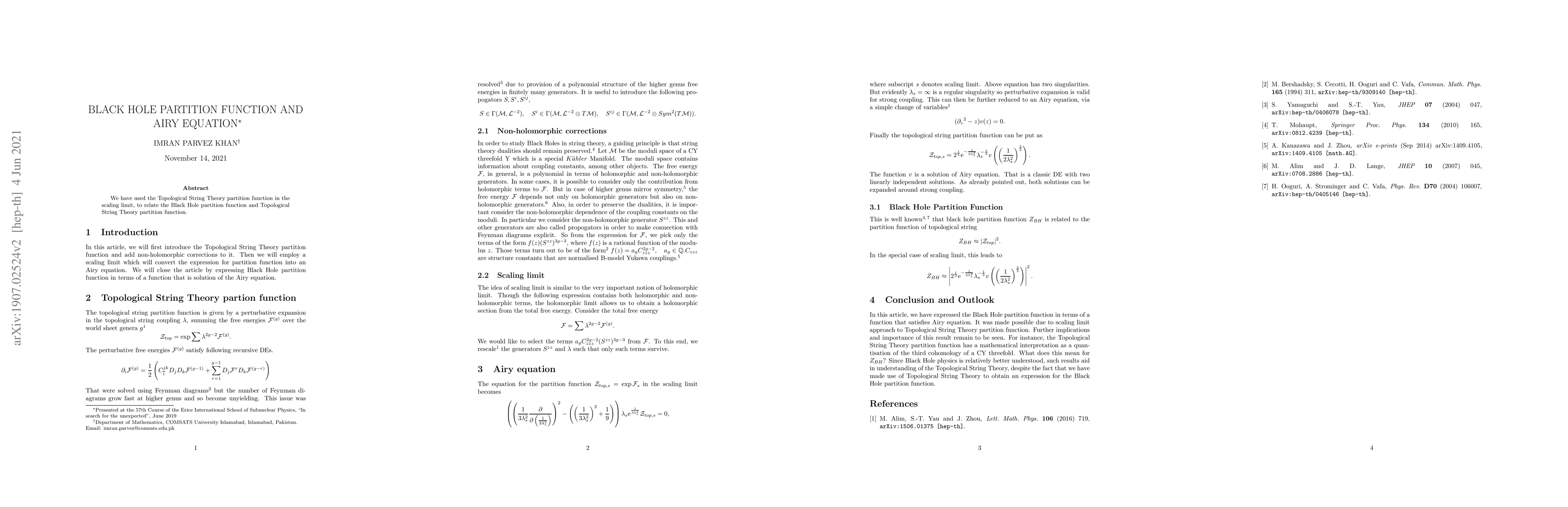 Summary: This paper connects the Black Hole partition function to the Topological String Theory partition function using the scaling limit of Topological String Theory, revealing a relationship through the Airy equation.