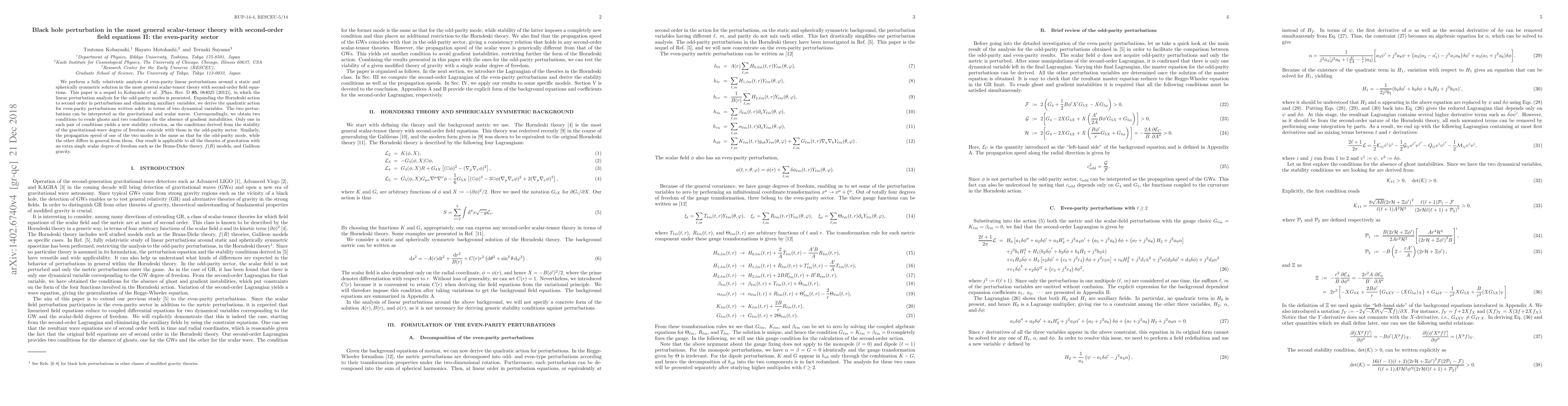 This paper analyzes even-parity linear perturbations in the most general scalar-tensor theory with second-order field equations, deriving a quadratic action for two dynamical variables representing gravitational and scalar waves. It establishes stability conditions and propagation speeds, showing that one mode's behavior mirrors that of odd-parity perturbations, while the other differs.