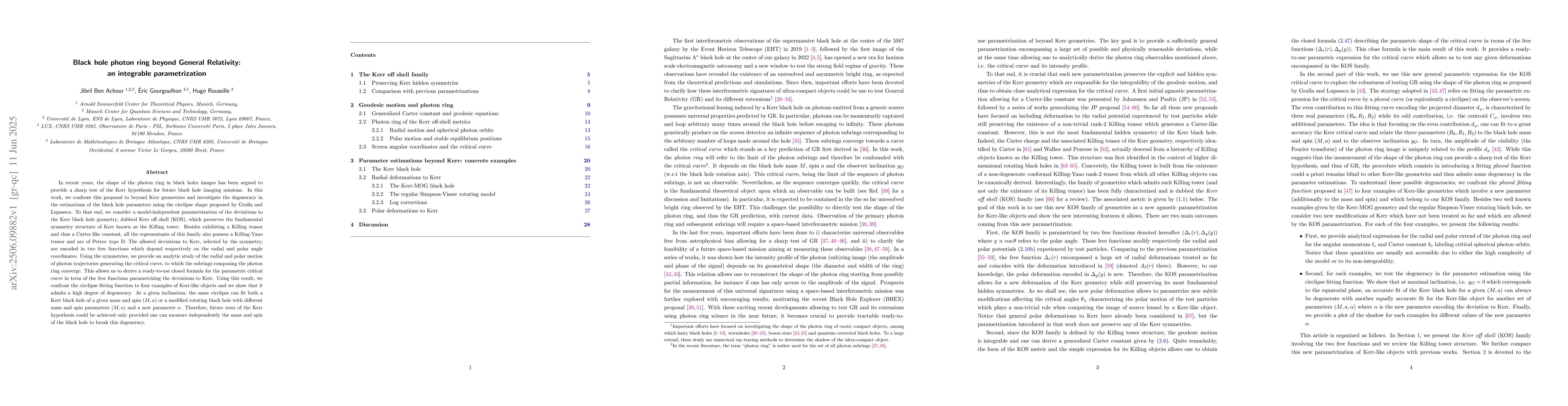 The paper introduces an integrable parametrization for the critical curve of beyond Kerr geometries, preserving the Kerr symmetries and providing a ready-to-use formula for the photon ring shape.