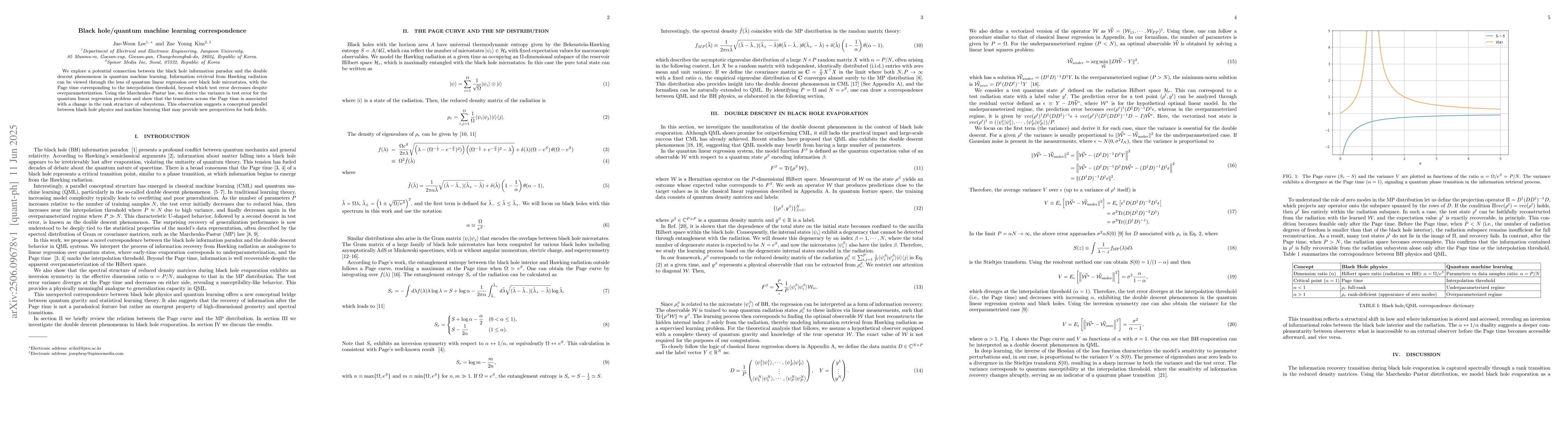 Researchers explore a connection between black hole information paradox and quantum machine learning, finding that test error decreases despite overparameterization beyond a certain threshold called Page time.