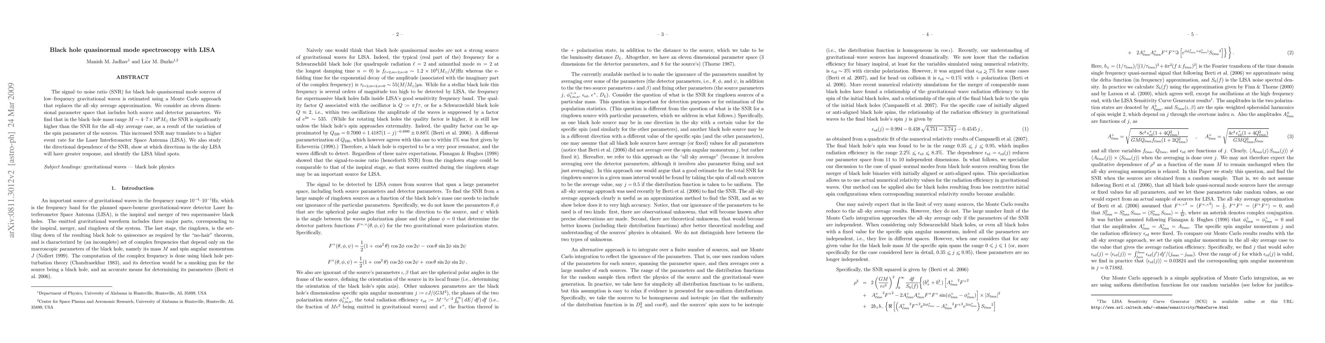 The signal-to-noise ratio (SNR) for black hole quasinormal mode sources of low-frequency gravitational waves is estimated using a Monte Carlo approach that replaces the all-sky average approximation. We consider an eleven dimensional parameter space that includes both source and detector parameters. We find that in the black-hole mass range $M\sim 4$-$7\times 10^6M_{\odot}$ the SNR is significantly higher than the SNR for the all-sky average case, as a result of the variation of the spin parameter of the sources. This increased SNR may translate to a higher event rate for the Laser Interferometer Space Antenna (LISA). We also study the directional dependence of the SNR, show at which directions in the sky LISA will have greater response, and identify the LISA blind spots.