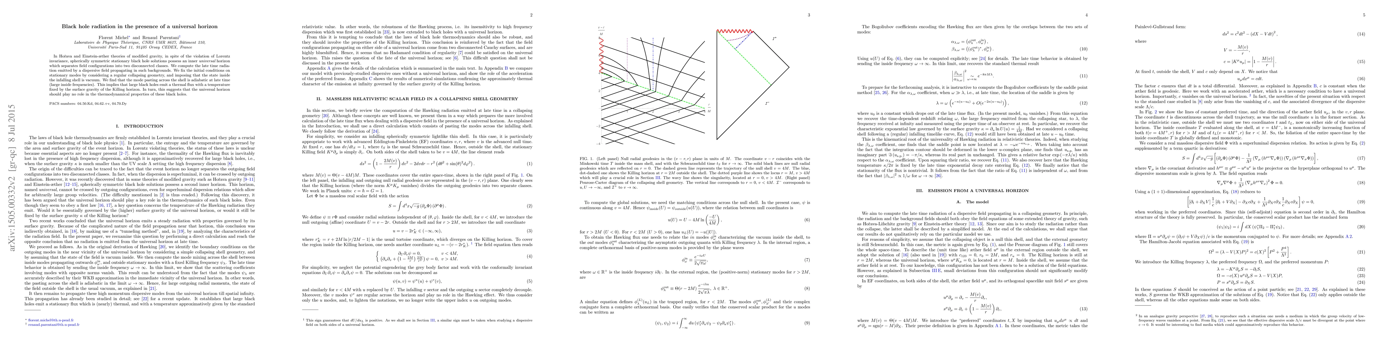 In Ho\v{r}ava and Einstein-{\AE}ther theories of modified gravity, in spite of the violation of Lorentz invariance, spherically-symmetric stationary black hole solutions possess an inner universal horizon which separates field configurations into two disconnected classes. We compute the late time radiation emitted by a dispersive field propagating in such backgrounds. We fix the initial conditions on stationary modes by considering a regular collapsing geometry, and imposing that the state inside the infalling shell is vacuum. We find that the mode pasting across the shell is adiabatic at late time (large inside frequencies). This implies that large black holes emit a thermal flux with a temperature fixed by the surface gravity of the Killing horizon. In turn, this suggests that the universal horizon should play no role in the thermodynamical properties of these black holes.