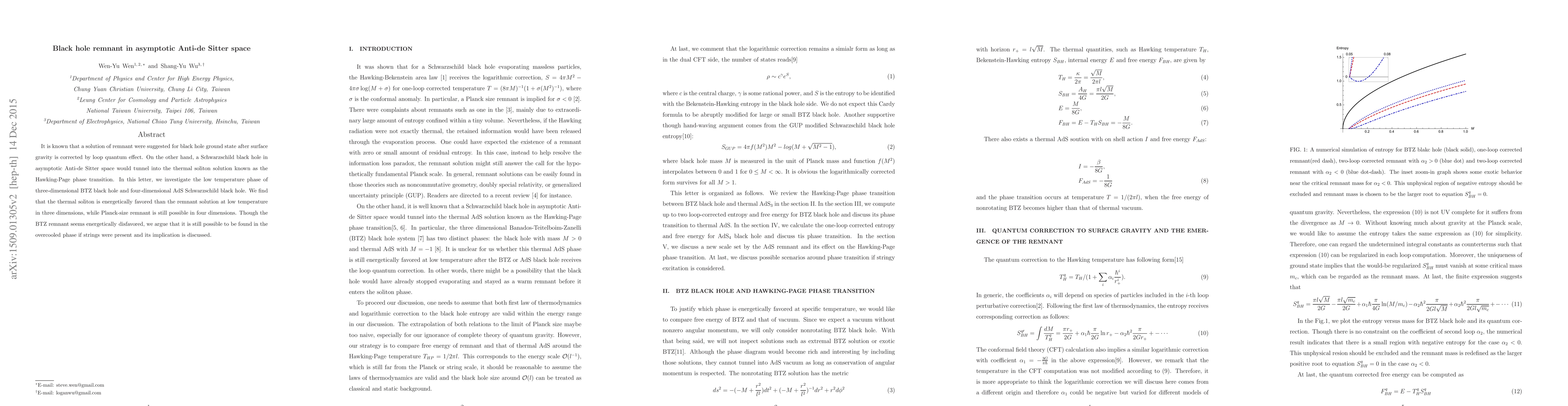 It is known that a solution of remnant were suggested for black hole ground state after surface gravity is corrected by loop quantum effect. On the other hand, a Schwarzschild black hole in asymptotic Anti-de Sitter space would tunnel into the thermal soliton solution known as the Hawking-Page phase transition. In this letter, we investigate the low temperature phase of three-dimensional BTZ black hole and four-dimensional AdS Schwarzschild black hole. We find that the thermal soliton is energetically favored than the remnant solution at low temperature in three dimensions, while Planck-size remnant is still possible in four dimensions. Though the BTZ remnant seems energetically disfavored, we argue that it is still possible to be found in the overcooled phase if strings were present and its implication is discussed.