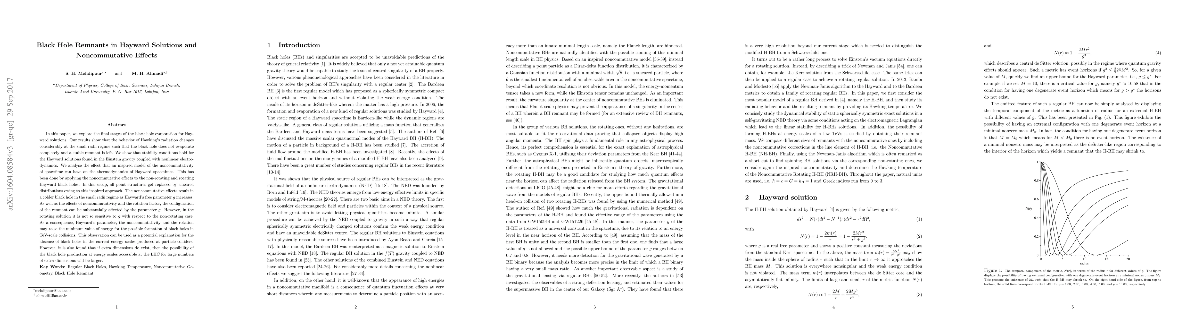 This paper investigates the remnants of black holes in Hayward solutions, revealing that non-complete evaporation leaves stable remnants due to changes in Hawking radiation behavior at small radii. Noncommutative effects on these remnants, especially in rotating and non-rotating Hayward black holes, suggest a colder black hole and potentially explain the absence of black holes at current collider energies, though extra dimensions could increase their production.