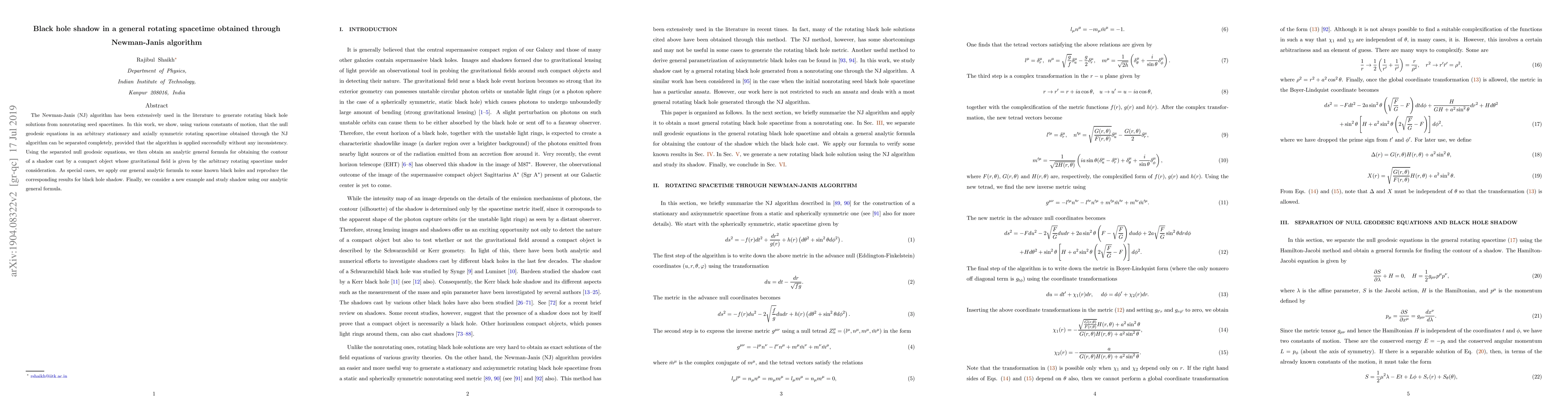 This paper utilizes the Newman-Janis algorithm to derive rotating black hole solutions and shows complete separation of null geodesics in the resulting spacetime. The authors provide an analytic formula for black hole shadows in arbitrary rotating spacetimes, applying it to known black holes and exploring a new example.