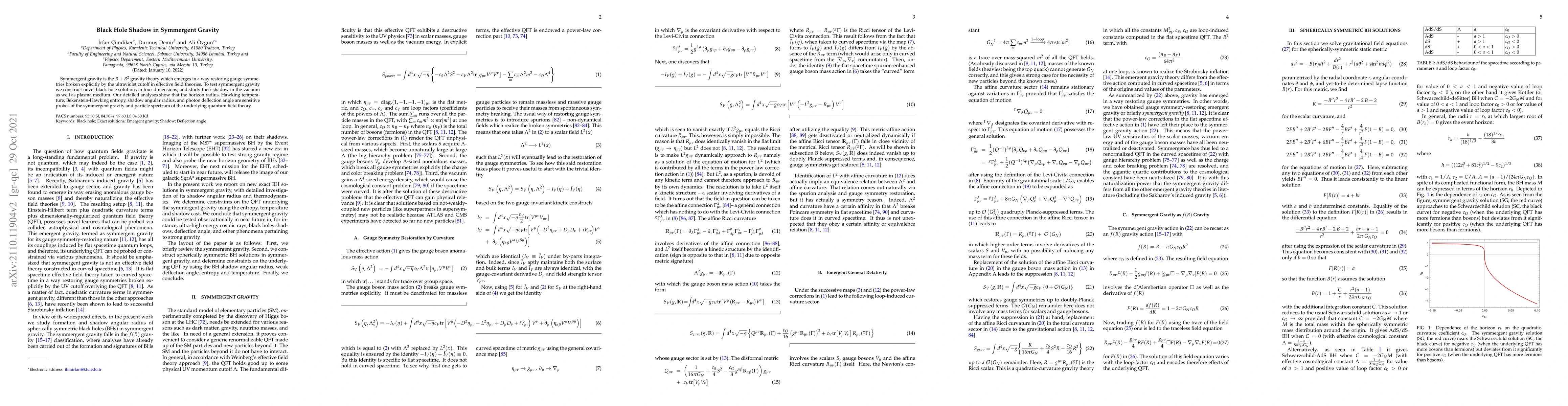 Symmergent gravity is the $R+R^2$ gravity theory which emerges in a way restoring gauge symmetries broken explicitly by the ultraviolet cutoff in effective field theories. To test symmergent gravity we construct novel black hole solutions in four dimensions, and study their shadow in the vacuum as well as plasma medium. Our detailed analyses show that the horizon radius, Hawking temperature, Bekenstein-Hawking entropy, shadow angular radius, and photon deflection angle are sensitive probes of the symmergent gravity and particle spectrum of the underlying quantum field theory.