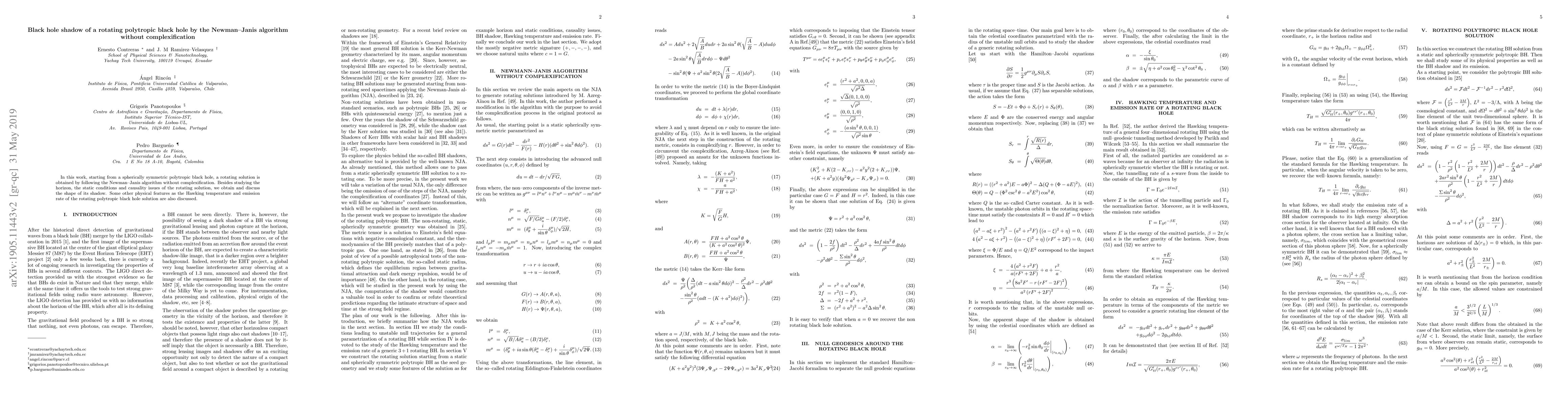 This paper derives a rotating polytropic black hole solution using the Newman-Janis algorithm without complexification and examines its shadow, static conditions, and causality. It also explores physical features such as Hawking temperature and emission rate.