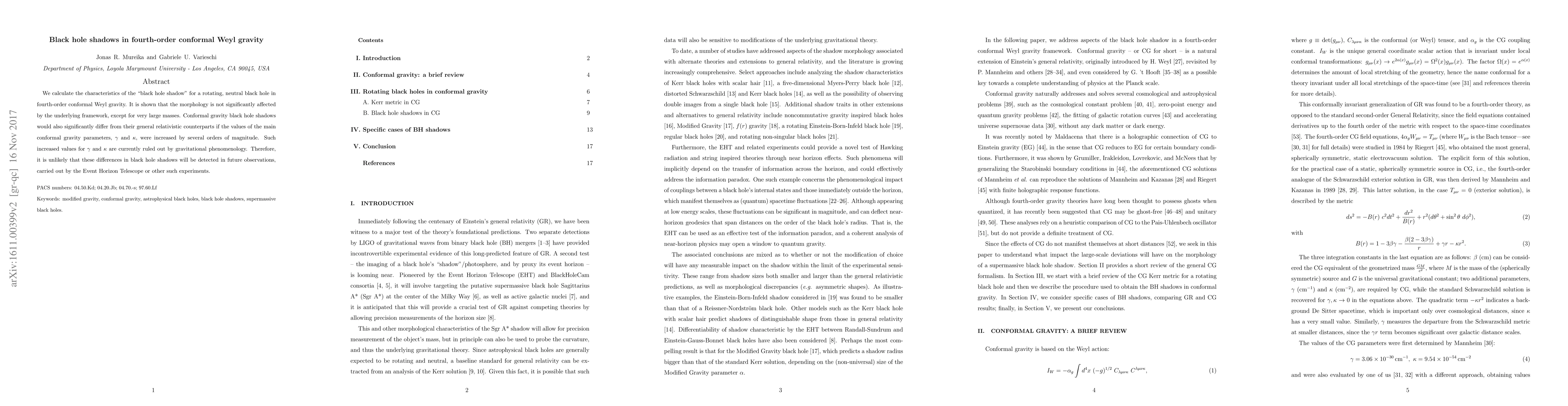 We calculate the characteristics of the "black hole shadow" for a rotating, neutral black hole in fourth-order conformal Weyl gravity. It is shown that the morphology is not significantly affected by the underlying framework, except for very large masses. Conformal gravity black hole shadows would also significantly differ from their general relativistic counterparts if the values of the main conformal gravity parameters, $\gamma$ and $\kappa$, were increased by several orders of magnitude. Such increased values for $\gamma$ and $\kappa$ are currently ruled out by gravitational phenomenology. Therefore, it is unlikely that these differences in black hole shadows will be detected in future observations, carried out by the Event Horizon Telescope or other such experiments.
