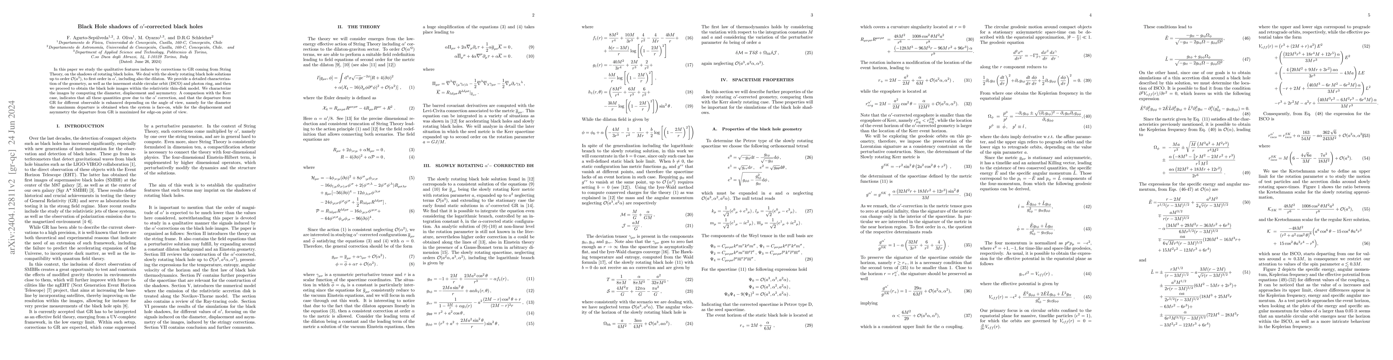 This paper examines how string theory corrections to general relativity affect the shadows of rotating black holes, detailing changes in geometry, the innermost stable circular orbit, and photon ring. The analysis reveals that $\alpha'$ corrections enlarge the black hole image dimensions, displacement, and asymmetry, with the greatest deviation from general relativity depending on the viewing angle.