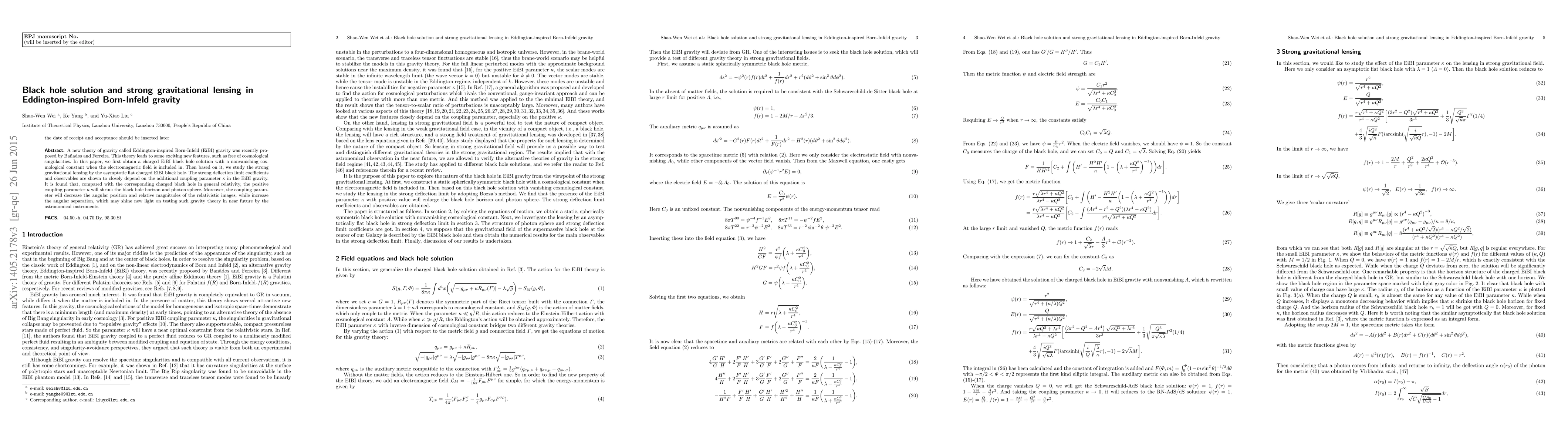 This paper presents a charged black hole solution in Eddington-inspired Born-Infeld (EiBI) gravity and investigates strong gravitational lensing by this solution. The study reveals that the coupling parameter $\kappa$ in EiBI gravity shrinks the black hole horizon and photon sphere, and alters the angular positions and magnitudes of relativistic images, potentially offering new avenues for testing the theory through astronomical observations.