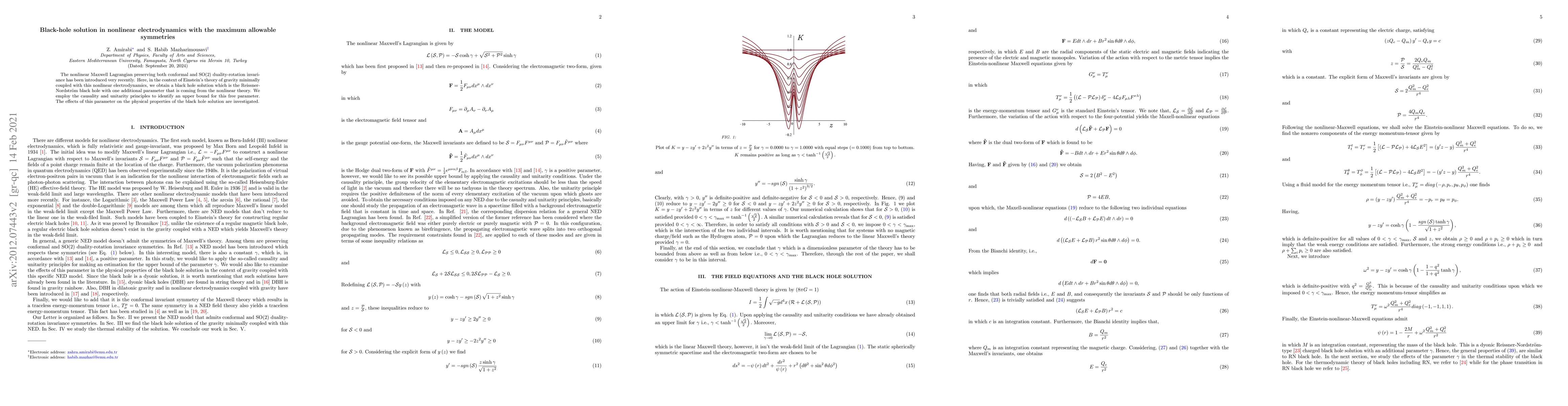 The nonlinear Maxwell Lagrangian preserving both conformal and SO(2) duality-rotation invariance has been introduced very recently. Here, in the context of Einstein's theory of gravity minimally coupled with this nonlinear electrodynamics, we obtain a black hole solution which is the Reissner-Nordstr\"{o}m black hole with one additional parameter that is coming from the nonlinear theory. We employ the causality and unitarity principles to identify an upper bound for this free parameter. The effects of this parameter on the physical properties of the black hole solution are investigated.