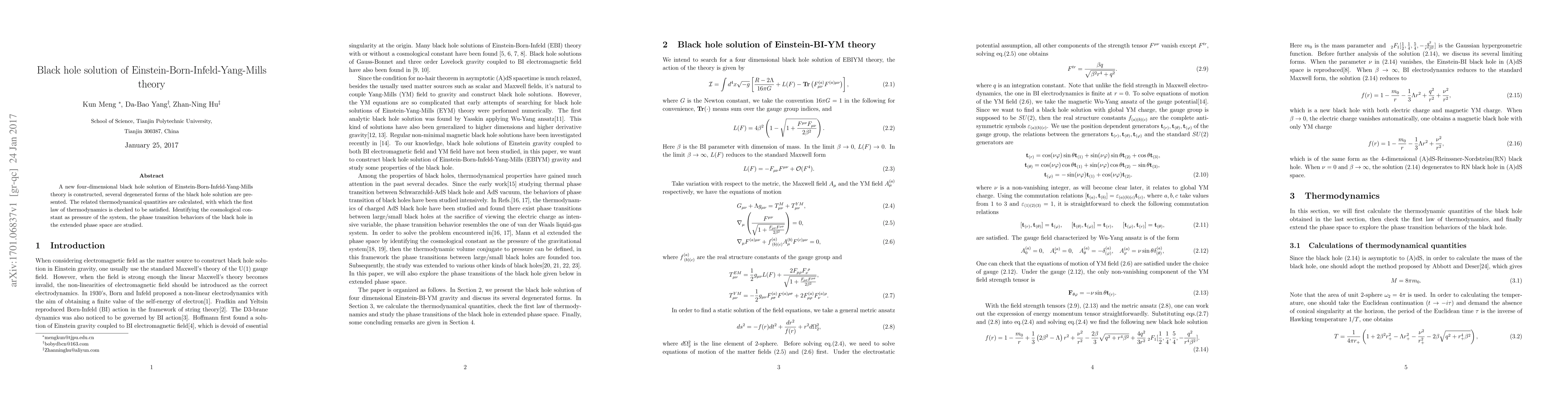 This research constructs a novel four-dimensional black hole solution in Einstein-Born-Infeld-Yang-Mills theory, examining thermodynamic properties and demonstrating satisfaction of the first law of thermodynamics, while also investigating phase transition behaviors considering the cosmological constant as system pressure.