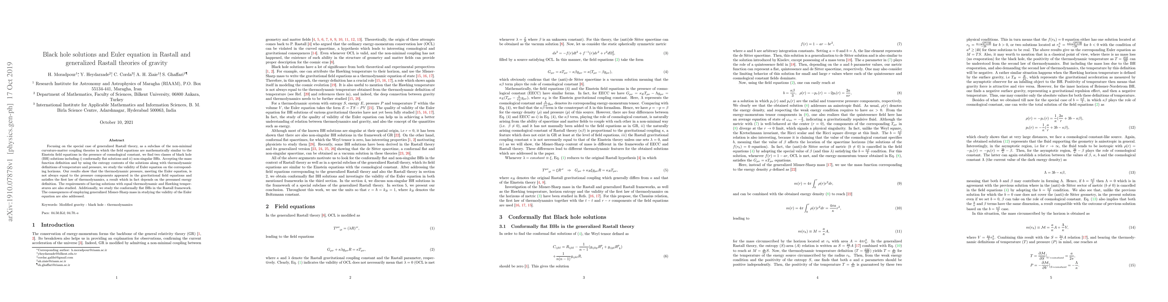 The paper presents detailed black hole solutions in Rastall and generalized Rastall theories, analyzing the Euler equation's validity on horizons and comparing thermodynamic pressure and temperature with Hawking temperature.