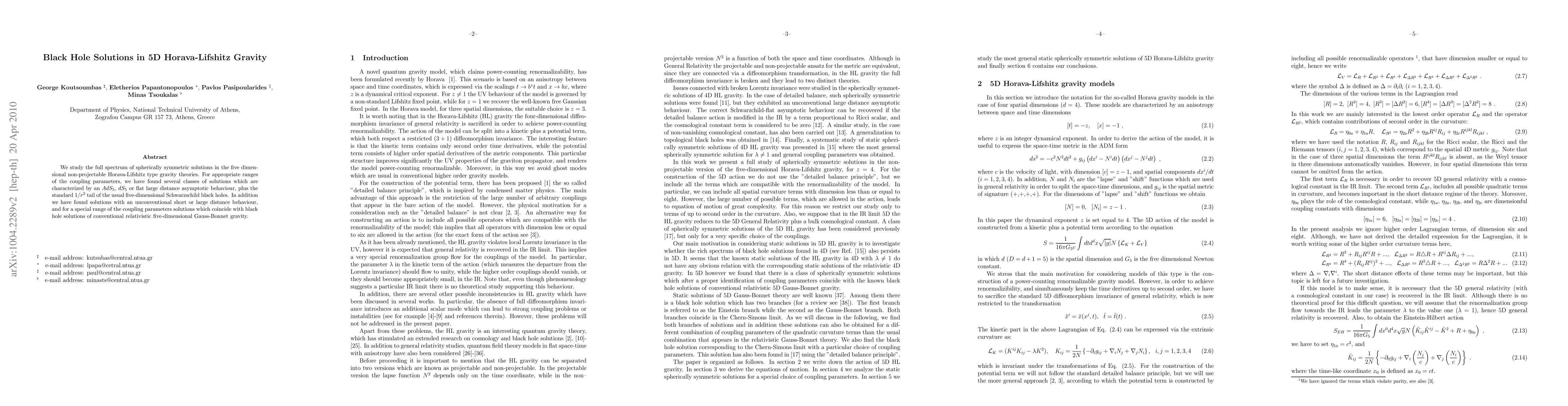 This paper explores spherically symmetric solutions in 5D Horava-Lifshitz gravity, identifying classes with AdS_5, dS_5, or flat asymptotic behaviors, alongside unconventional short/large distance behaviors. Some solutions match those in conventional five-dimensional Gauss-Bonnet gravity under specific coupling parameters.