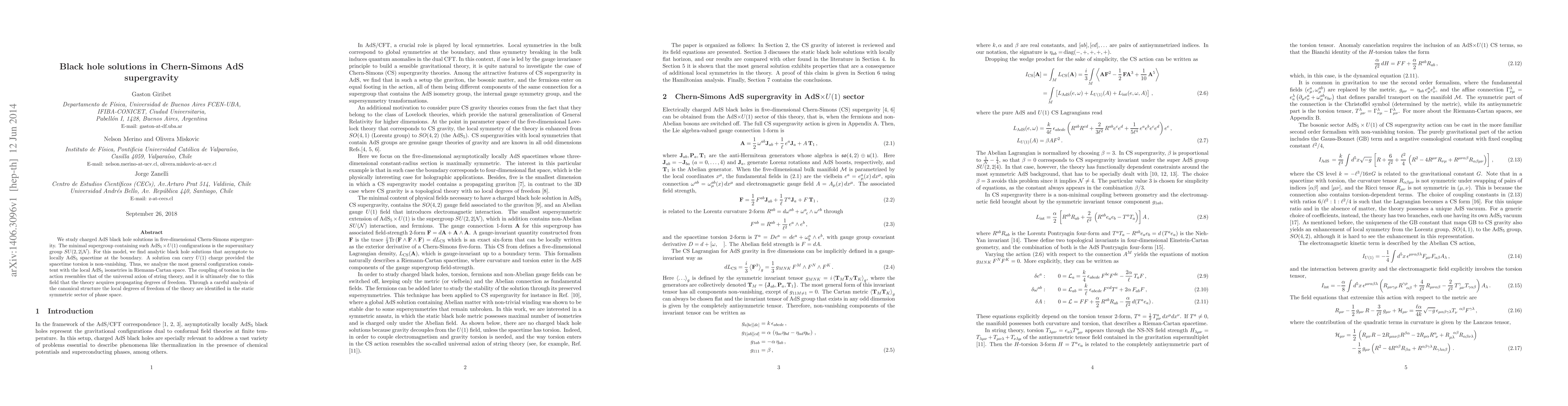 We study charged AdS black hole solutions in five-dimensional Chern-Simons supergravity. The minimal supergroup containing such AdSxU(1) configurations is the superunitary group SU(2,2|N). For this model, we find analytic black hole solutions that asymptote to locally AdS spacetime at the boundary. A solution can carry U(1) charge provided the spacetime torsion is non-vanishing. Thus, we analyze the most general configuration consistent with the local AdS isometries in Riemann-Cartan space. The coupling of torsion in the action resembles that of the universal axion of string theory, and it is ultimately due to this field that the theory acquires propagating degrees of freedom. Through a careful analysis of the canonical structure the local degrees of freedom of the theory are identified in the static symmetric sector of phase space.