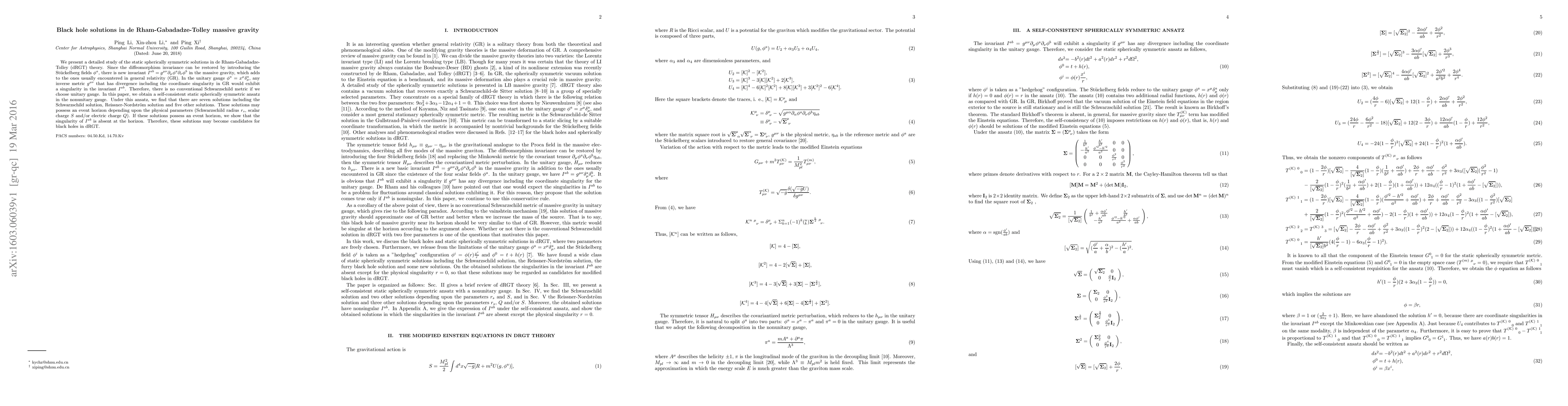We present a detailed study of the static spherically symmetric solutions in de Rham-Gabadadze-Tolley (dRGT) theory. Since the diffeomorphism invariance can be restored by introducing the St\"{u}ckelberg fields $\phi^a$, there is new invariant $I^{ab}=g^{\mu\nu}\partial_{\mu}\phi^a\partial_\nu\phi^b$ in the massive gravity, which adds to the ones usually encountered in general relativity (GR). In the unitary gauge $\phi^a=x^\mu\delta_\mu^a$, any inverse metric $g^{\mu\nu}$ that has divergence including the coordinate singularity in GR would exhibit a singularity in the invariant $I^{ab}$. Therefore, there is no conventional Schwarzschild metric if we choose unitary gauge. In this paper, we obtain a self-consistent static spherically symmetric ansatz in the nonunitary gauge. Under this ansatz, we find that there are seven solutions including the Schwarzschild solution, Reissner-Nordstr\"{o}m solution and five other solutions. These solutions may possess an event horizon depending upon the physical parameters (Schwarzschild radius $r_s$, scalar charge $S$ and/or electric charge $Q$). If these solutions possess an event horizon, we show that the singularity of $I^{ab}$ is absent at the horizon. Therefore, these solutions may become candidates for black holes in dRGT.