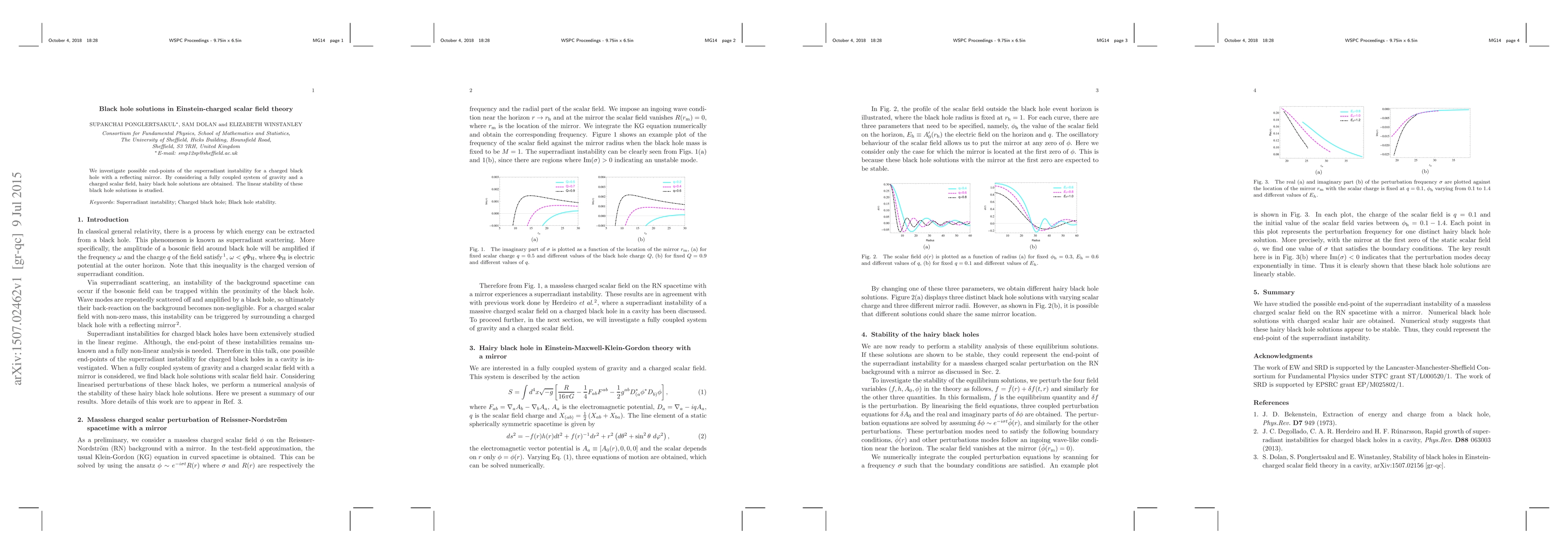 This paper explores the end-states of superradiant instability in charged black holes with reflecting mirrors, deriving hairy black hole solutions from a coupled system of gravity and charged scalar fields, and examines their linear stability.