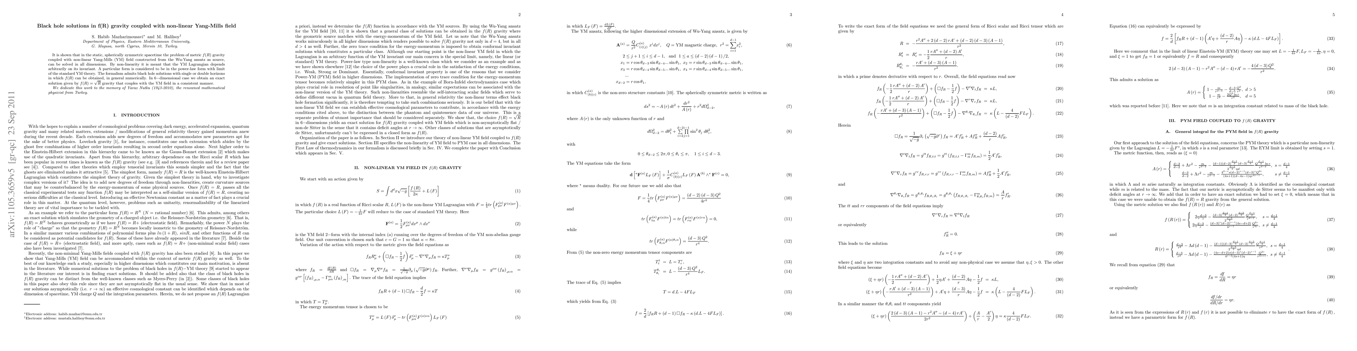 This paper explores black hole solutions in f(R) gravity coupled with non-linear Yang-Mills fields, demonstrating solvability in all dimensions using a static, spherically symmetric metric. An exact solution is found in 6 dimensions for f(R) gravity coupled with a power-law form of the Yang-Mills field.