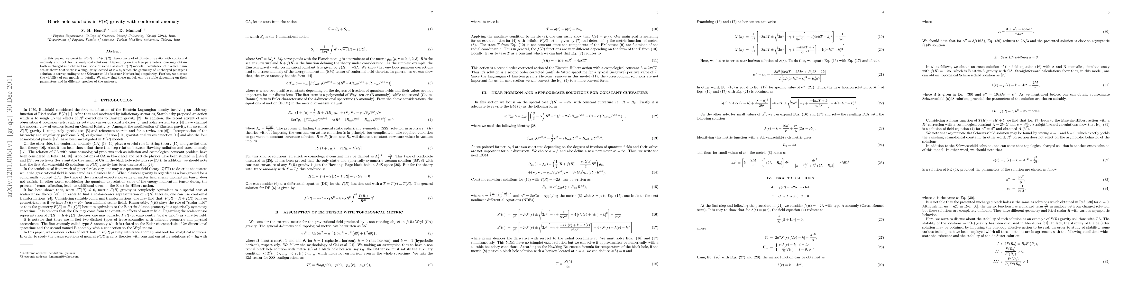 In this paper, we consider $F(R)=R+f(R)$ theory instead of Einstein gravity with conformal anomaly and look for its analytical solutions. Depending on the free parameters, one may obtain both uncharged and charged solutions for some classes of $F(R)$ models. Calculation of Kretschmann scalar shows that there is a singularity located at $r=0$, which the geometry of uncharged (charged) solution is corresponding to the Schwarzschild (Reissner-Nordstr\"om) singularity. Further, we discuss the viability of our models in details. We show that these models can be stable depending on their parameters and in different epoches of the universe.