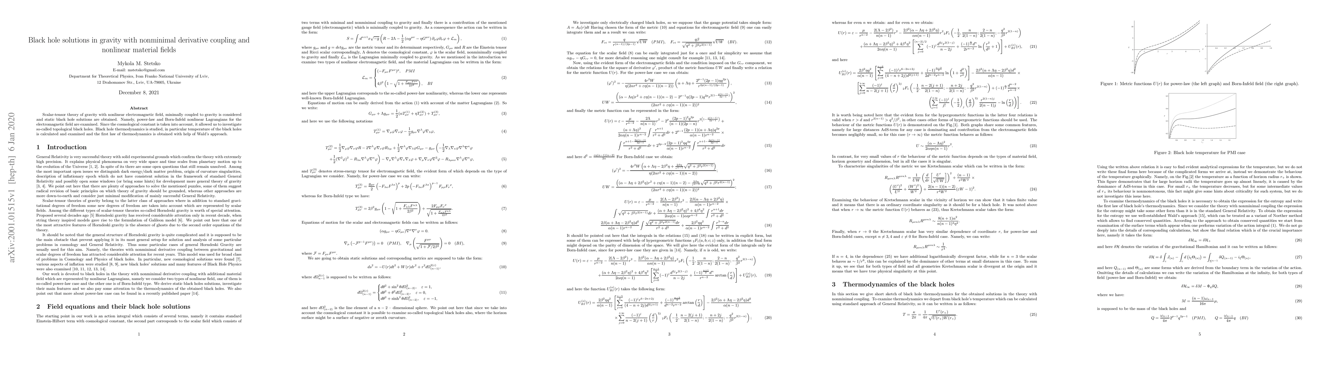 This paper explores static black hole solutions in scalar-tensor gravity with nonminimal derivative coupling and nonlinear electromagnetic fields, specifically using power-law and Born-Infeld Lagrangians. It investigates topological black holes, calculates their temperature, and derives the first law of thermodynamics using Wald's approach.