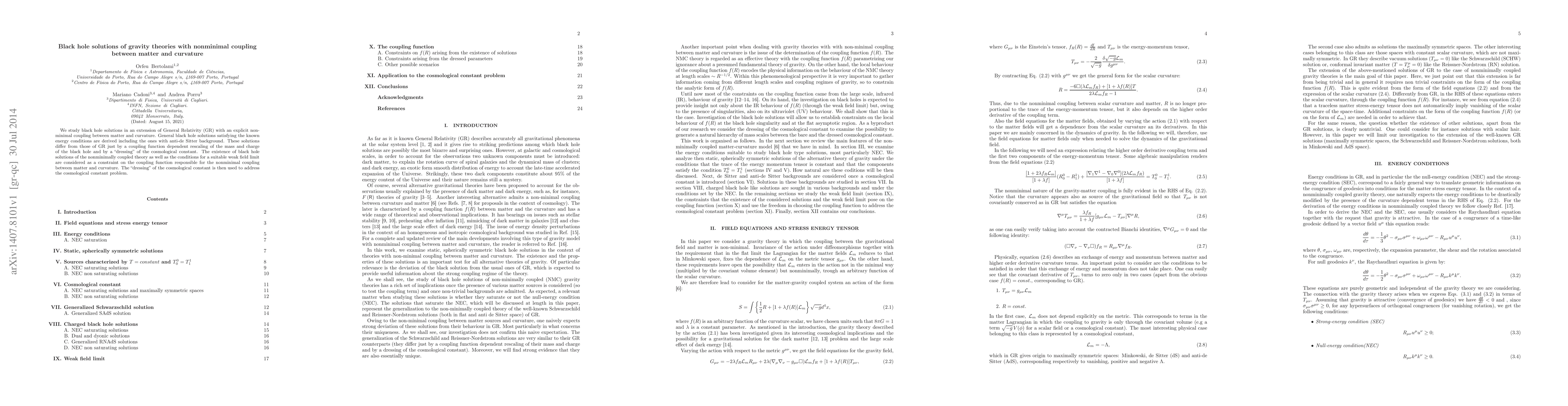 We study black hole solutions in an extension of General Relativity (GR) with an explicit non-minimal coupling between matter and curvature. General black hole solutions satisfying the known energy conditions are derived including the ones with anti-de Sitter background. These solutions differ from those of GR just by a coupling function dependent rescaling of the mass and charge of the black hole and by a "dressing" of the cosmological constant. The existence of black hole solutions of the nonminimally coupled theory as well as the conditions for a suitable weak field limit are considered as a constraint on the coupling function responsible for the nonminimal coupling between matter and curvature. The "dressing" of the cosmological constant is then used to address the cosmological constant problem.