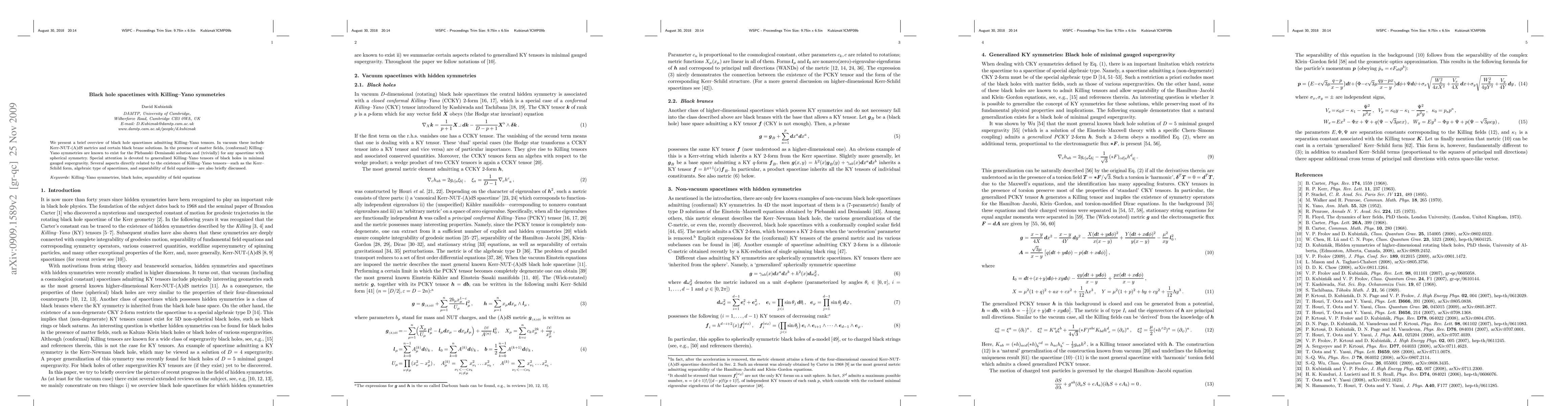 This paper reviews black hole spacetimes with Killing-Yano symmetries, focusing on Kerr-NUT-(A)dS metrics and black brane solutions in vacuum, and the Plebanski-Demianski solution with matter fields. It also explores generalized Killing-Yano tensors in minimal gauged supergravity and discusses related aspects like the Kerr-Schild form and separability of field equations.