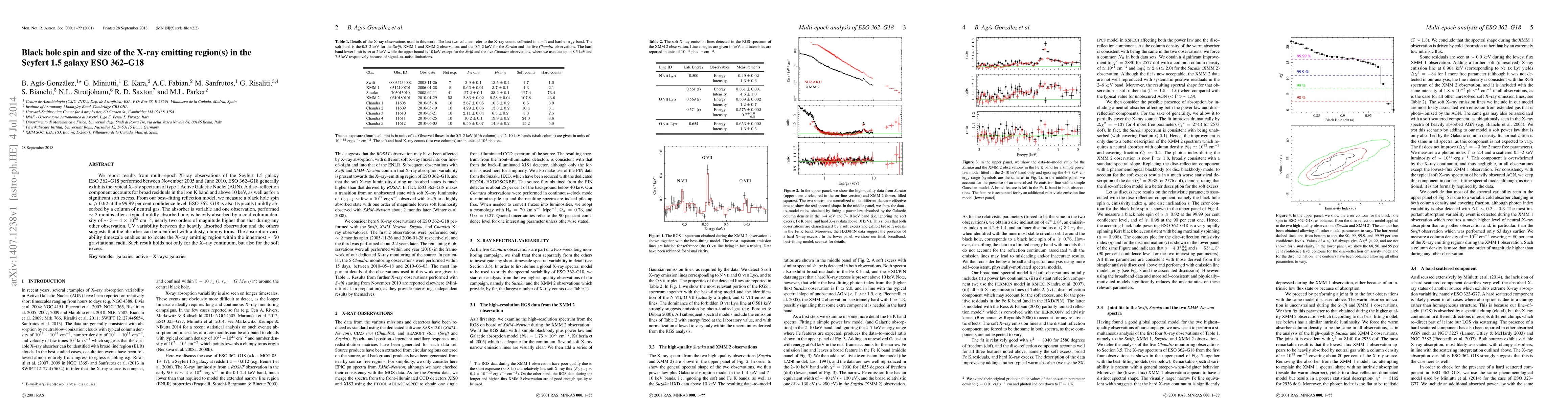 This study reports on multi-epoch X-ray observations of the Seyfert 1.5 galaxy ESO 362-G18, revealing a black hole spin of ≥0.92 with high confidence. The X-ray emitting region is constrained within the innermost ~50 gravitational radii based on absorption variability.