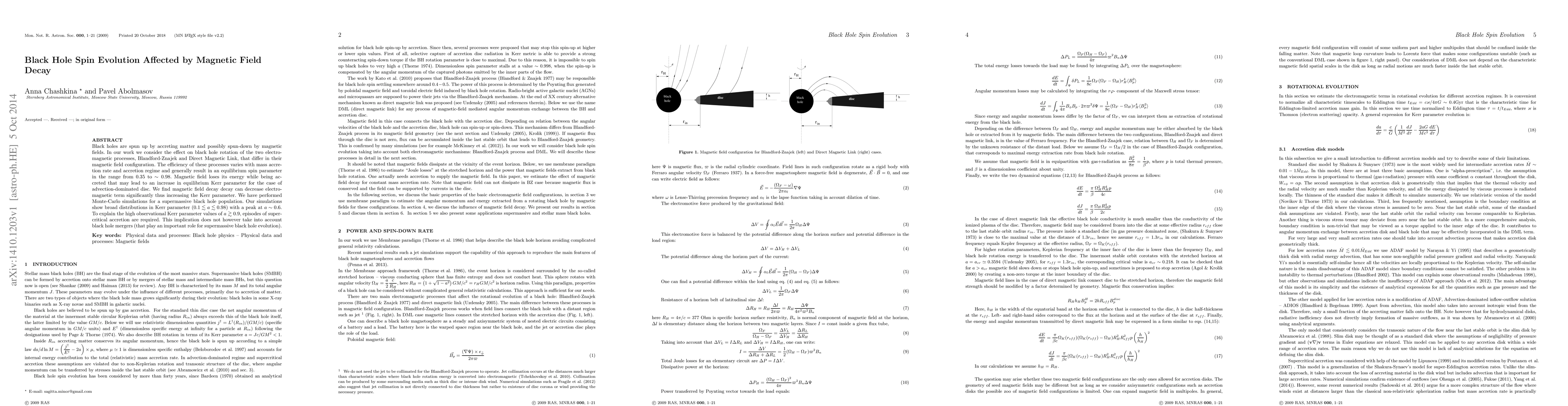 Black holes are spun up by accreting matter and possibly spun-down by magnetic fields. In our work we consider the effect on black hole rotation of the two electromagnetic processes, Blandford-Znajek and Direct Magnetic Link, that differ in their magnetic field configuration. The efficiency of these processes varies with mass accretion rate and accretion regime and generally result in an equilibrium spin parameter in the range from 0.35 to ~0.98. Magnetic field loses its energy while being accreted that may lead to an increase in equilibrium Kerr parameter for the case of advection-dominated disc. We find magnetic field decay decay can decrease electromagnetic term significantly thus increasing the Kerr parameter. We have performed Monte-Carlo simulations for a supermassive black hole population. Our simulations show broad distributions in Kerr parameter (0.1< a <0.98) with a peak at a~0.6. To explain the high observational Kerr parameter values of a>0.9, episodes of supercritical accretion are required. This implication does not however take into account black hole mergers (that play an important role for supermassive black hole evolution).
