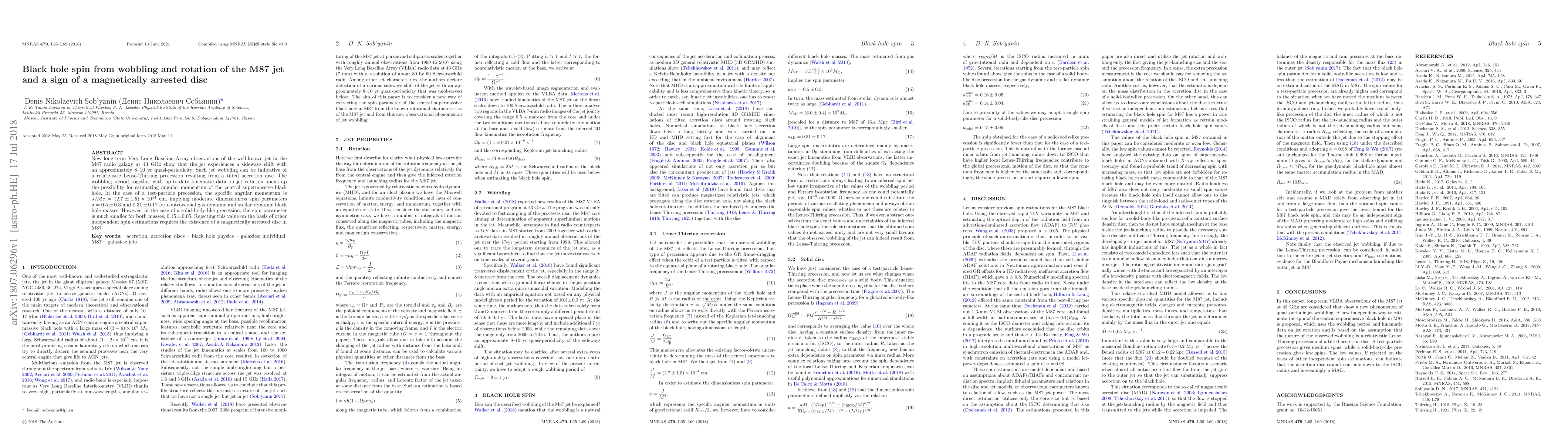 New long-term Very Long Baseline Array observations of the well-known jet in the M87 radio galaxy at 43 GHz show that the jet experiences a sideways shift with an approximately 8-10 yr quasi-periodicity. Such jet wobbling can be indicative of a relativistic Lense-Thirring precession resulting from a tilted accretion disc. The wobbling period together with up-to-date kinematic data on jet rotation opens up the possibility for estimating angular momentum of the central supermassive black hole. In the case of a test-particle precession, the specific angular momentum is $J/Mc=(2.7\pm1.5)\times10^{14}$ cm, implying moderate dimensionless spin parameters $a=0.5\pm0.3$ and $0.31\pm0.17$ for controversial gas-dynamic and stellar-dynamic black hole masses. However, in the case of a solid-body-like precession, the spin parameter is much smaller for both masses, $0.15\pm0.05$. Rejecting this value on the basis of other independent spin estimations requires the existence of a magnetically arrested disc in M87.