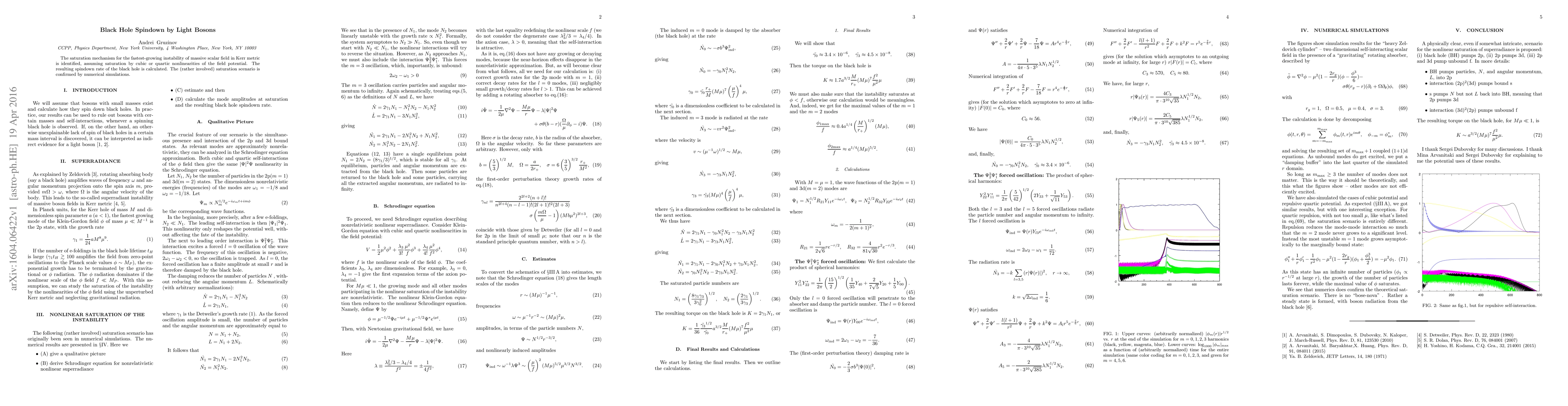 The saturation mechanism for the fastest-growing instability of massive scalar field in Kerr metric is identified, assuming saturation by cubic or quartic nonlinearities of the field potential. The resulting spindown rate of the black hole is calculated. The (rather involved) saturation scenario is confirmed by numerical simulations.