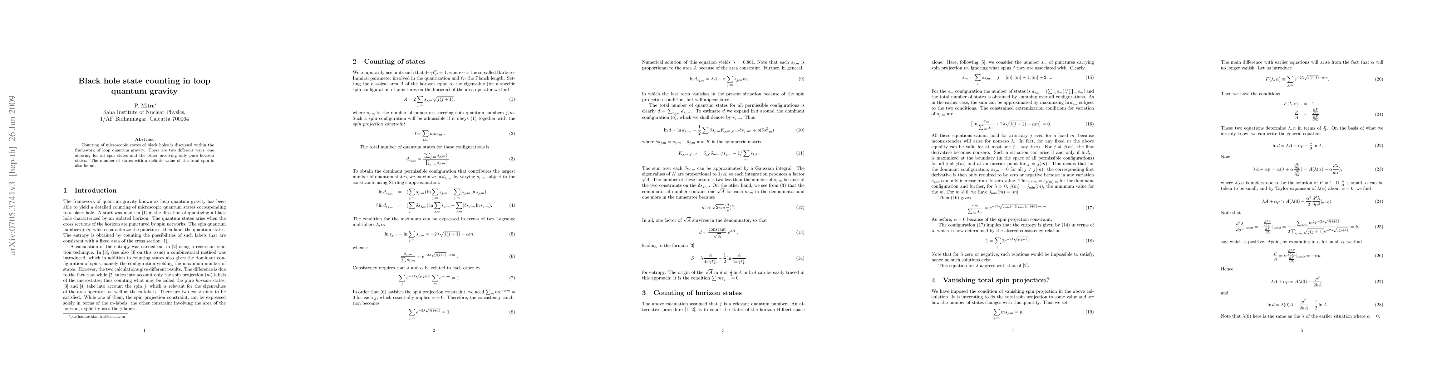 Counting of microscopic states of black holes is discussed within the framework of loop quantum gravity. There are two different ways, one allowing for all spin states and the other involving only pure horizon states. The number of states with a definite value of the total spin is also found.