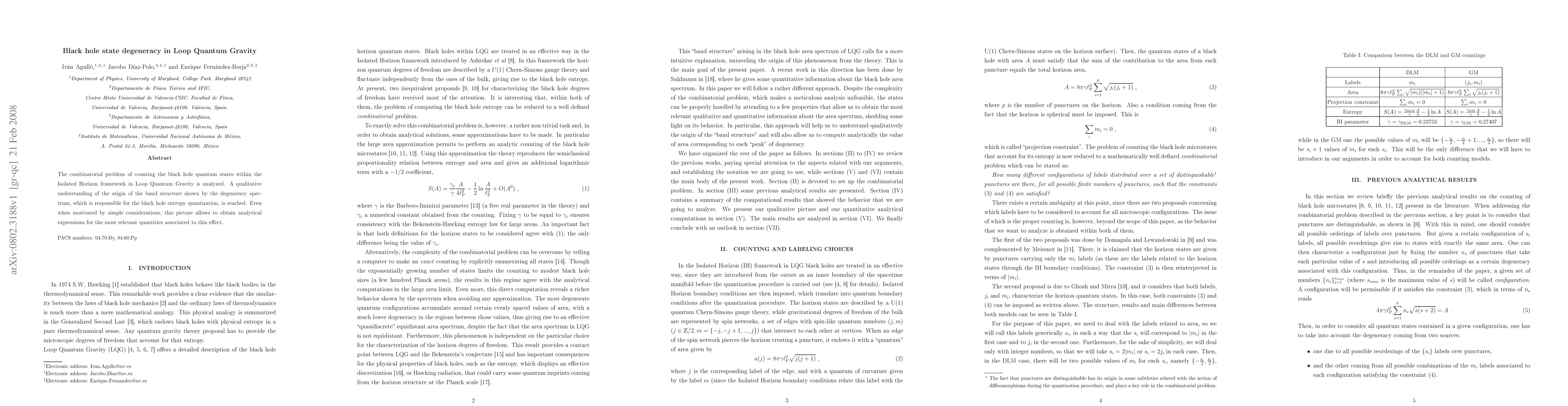 The combinatorial problem of counting the black hole quantum states within the Isolated Horizon framework in Loop Quantum Gravity is analyzed. A qualitative understanding of the origin of the band structure shown by the degeneracy spectrum, which is responsible for the black hole entropy quantization, is reached. Even when motivated by simple considerations, this picture allows to obtain analytical expressions for the most relevant quantities associated to this effect.