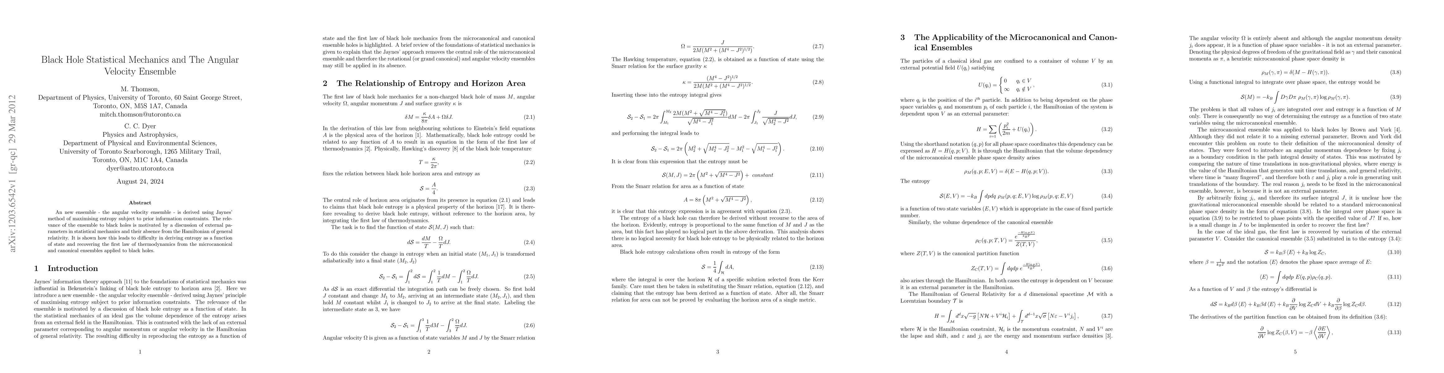An new ensemble - the angular velocity ensemble - is derived using Jaynes' method of maximising entropy subject to prior information constraints. The relevance of the ensemble to black holes is motivated by a discussion of external parameters in statistical mechanics and their absence from the Hamiltonian of general relativity. It is shown how this leads to difficulty in deriving entropy as a function of state and recovering the first law of thermodynamics from the microcanonical and canonical ensembles applied to black holes.