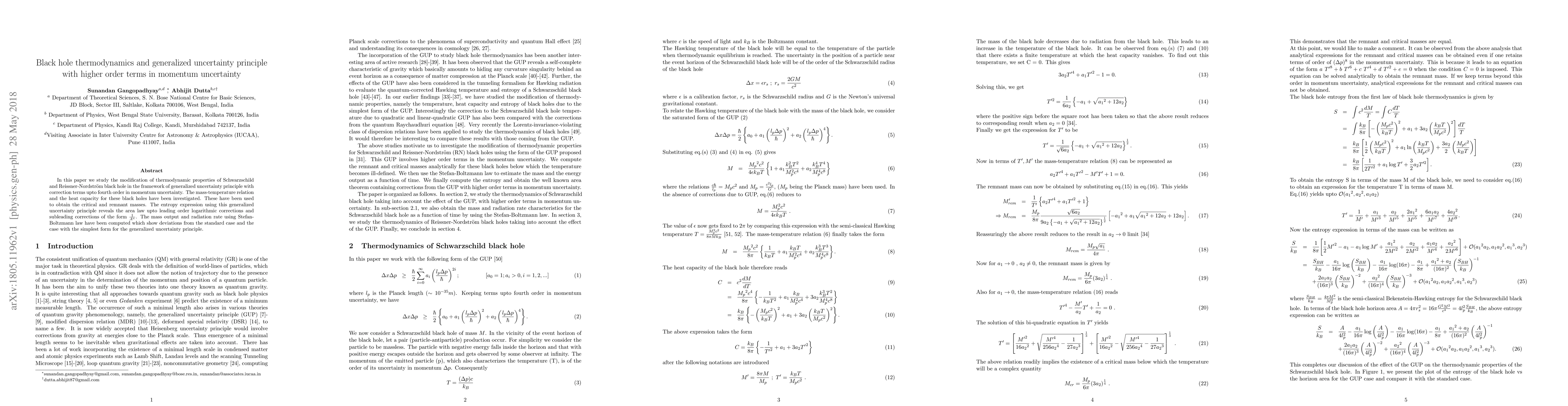 This paper investigates the thermodynamic properties of Schwarzschild and Reissner-Nordström black holes under a generalized uncertainty principle with higher-order momentum corrections. It finds modified mass-temperature relations, heat capacity, and entropy expressions, revealing logarithmic and fractional area corrections, and computes mass output and radiation rates showing deviations from standard models.