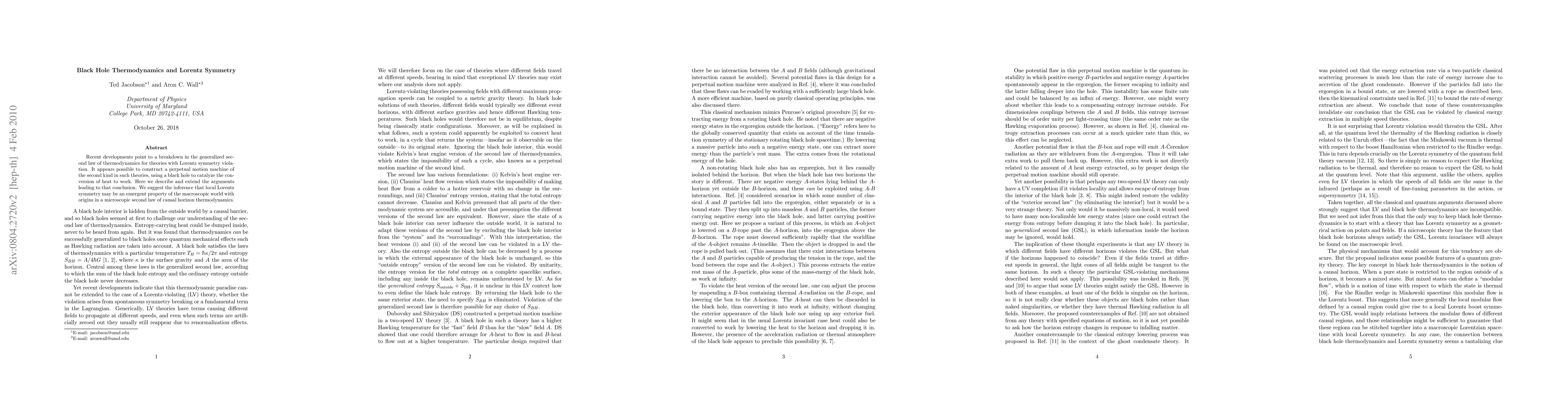 Recent developments point to a breakdown in the generalized second law of thermodynamics for theories with Lorentz symmetry violation. It appears possible to construct a perpetual motion machine of the second kind in such theories, using a black hole to catalyze the conversion of heat to work. Here we describe and extend the arguments leading to that conclusion. We suggest the inference that local Lorentz symmetry may be an emergent property of the macroscopic world with origins in a microscopic second law of causal horizon thermodynamics.