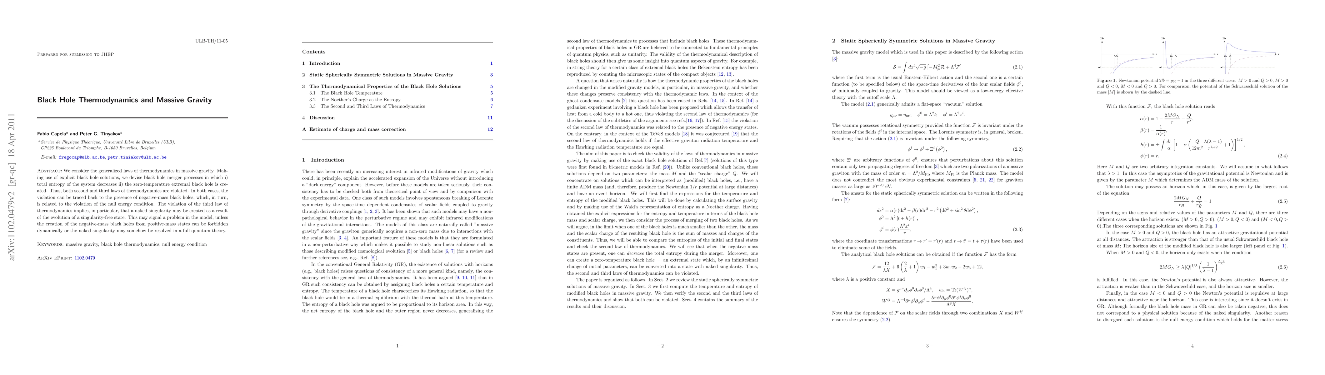 We consider the generalized laws of thermodynamics in massive gravity. Making use of explicit black hole solutions, we devise black hole merger processes in which i) total entropy of the system decreases ii) the zero-temperature extremal black hole is created. Thus, both second and third laws of thermodynamics are violated. In both cases, the violation can be traced back to the presence of negative-mass black holes, which, in turn, is related to the violation of the null energy condition. The violation of the third law of thermodynamics implies, in particular, that a naked singularity may be created as a result of the evolution of a singularity-free state. This may signal a problem in the model, unless the creation of the negative-mass black holes from positive-mass states can be forbidden dynamically or the naked singularity may somehow be resolved in a full quantum theory.