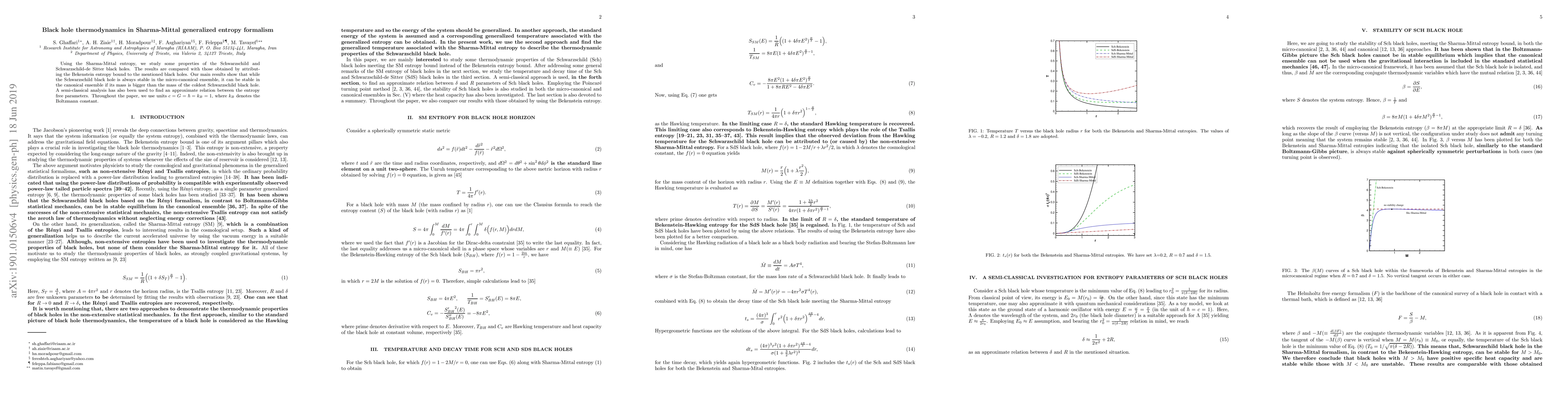 This paper investigates the thermodynamic properties of Schwarzschild and Schwarzschild-de Sitter black holes using the Sharma-Mittal entropy formalism, comparing results to traditional Bekenstein entropy. It finds that while Schwarzschild black holes are stable in the micro-canonical ensemble, stability in the canonical ensemble depends on the mass exceeding that of the coldest black hole.