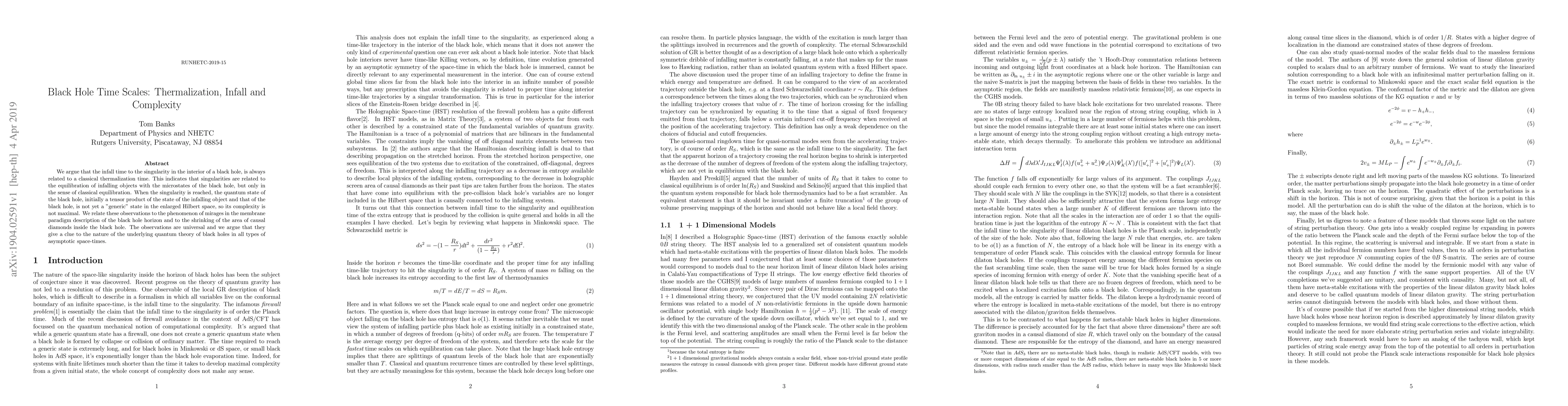 The paper discusses that the time it takes for matter to fall into a black hole (infall time) is linked to a classical thermalization time, suggesting a classical equilibration with black hole microstates. Upon singularity reach, the quantum state isn't maximally complex. These observations, applicable across various space-time asymptotic types, relate to black hole horizon mirages and shrinking causal diamond areas, offering insights into the quantum theory of black holes.
