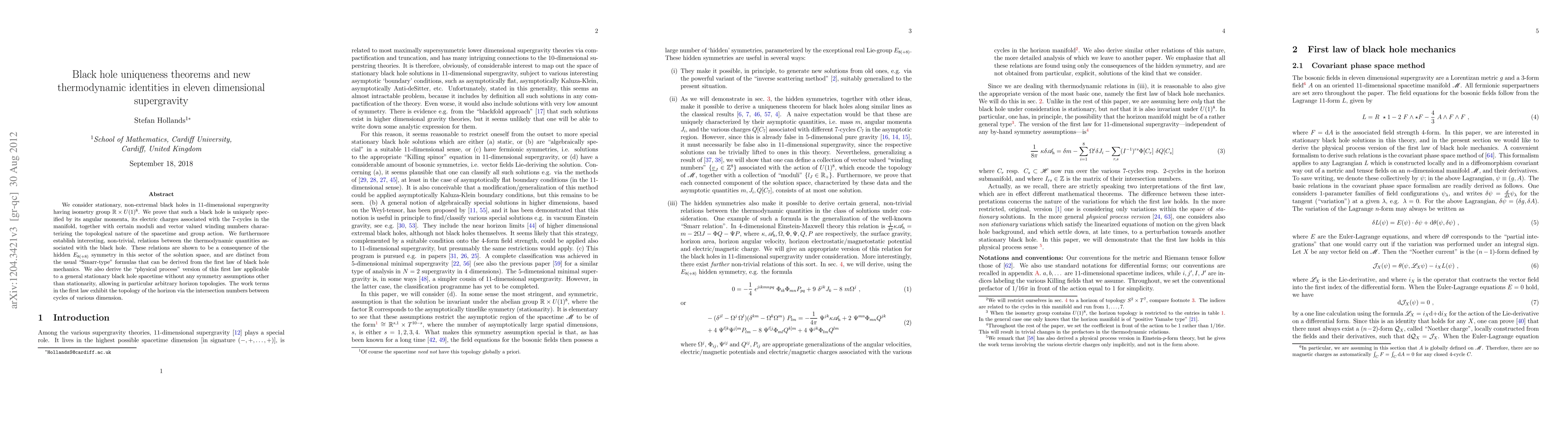 We consider stationary, non-extremal black holes in 11-dimensional supergravity having isometry group $\mathbb{R} \times U(1)^8$. We prove that such a black hole is uniquely specified by its angular momenta, its electric charges associated with the various 7-cycles in the manifold, together with certain moduli and vector valued winding numbers characterizing the topological nature of the spacetime and group action. We furthermore establish interesting, non-trivial, relations between the thermodynamic quantities associated with the black hole. These relations are shown to be a consequence of the hidden $E_{8(+8)}$ symmetry in this sector of the solution space, and are distinct from the usual "Smarr-type" formulas that can be derived from the first law of black hole mechanics. We also derive the "physical process" version of this first law applicable to a general stationary black hole spacetime without any symmetry assumptions other than stationarity, allowing in particular arbitrary horizon topologies. The work terms in the first law exhibit the topology of the horizon via the intersection numbers between cycles of various dimensions.