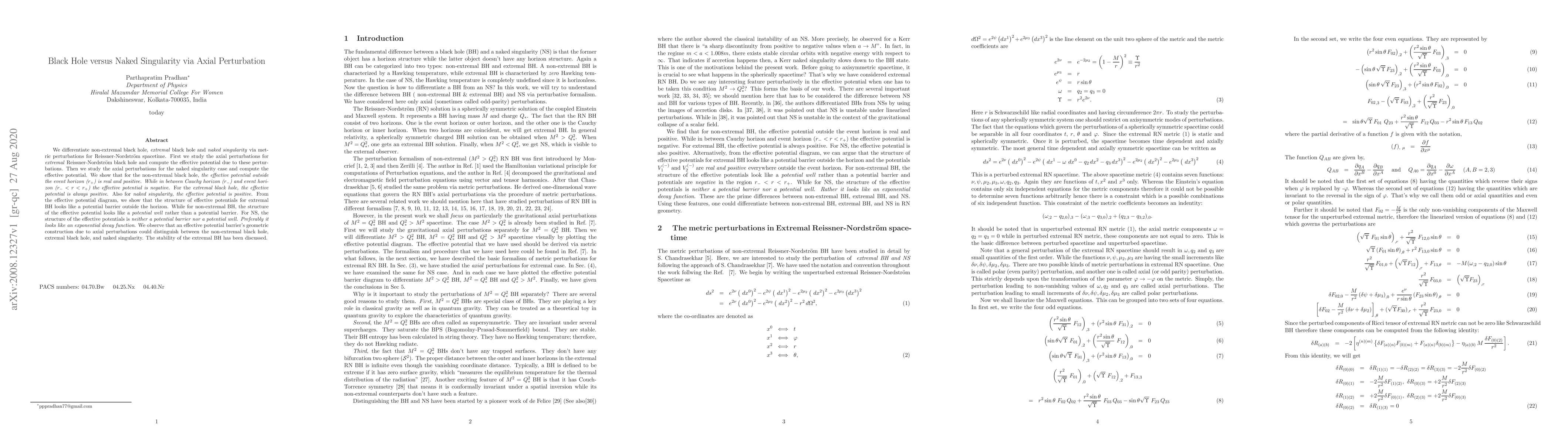This paper differentiates between non-extremal black holes, extremal black holes, and naked singularities via axial perturbations in Reissner-Nordström spacetime. It finds that effective potentials outside the event horizon are real and positive for non-extremal black holes, always positive for extremal black holes, and positive with an exponential decay for naked singularities, allowing for their distinction based on perturbation analysis.