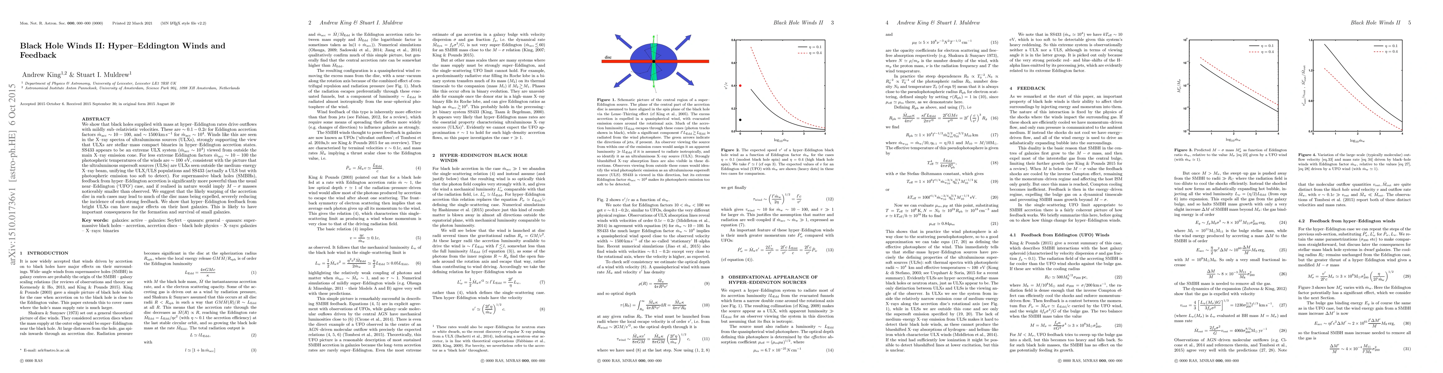 We show that black holes supplied with mass at hyper--Eddington rates drive outflows with mildly sub--relativistic velocities. These are $\sim 0.1 - 0.2c$ for Eddington accretion factors $\dot m_{\rm acc} \sim 10 - 100$, and $\sim 1500\,{\rm km\, s^{-1}}$ for $\dot m_{\rm acc} \sim 10^4$. Winds like this are seen in the X--ray spectra of ultraluminous sources (ULXs), strongly supporting the view that ULXs are stellar--mass compact binaries in hyper--Eddington accretion states. SS433 appears to be an extreme ULX system ($\dot m_{\rm acc} \sim 10^4$) viewed from outside the main X--ray emission cone. For less extreme Eddington factors $\dot m_{\rm acc} \sim 10 - 100$ the photospheric temperatures of the winds are $\sim 100$\, eV, consistent with the picture that the ultraluminous supersoft sources (ULSs) are ULXs seen outside the medium--energy X--ray beam, unifying the ULX/ULS populations and SS433 (actually a ULS but with photospheric emission too soft to detect). For supermassive black holes (SMBHs), feedback from hyper--Eddington accretion is significantly more powerful than the usual near--Eddington (`UFO') case, and if realised in nature would imply $M - \sigma$ masses noticeably smaller than observed. We suggest that the likely warping of the accretion disc in such cases may lead to much of the disc mass being expelled, severely reducing the incidence of such strong feedback. We show that hyper--Eddington feedback from bright ULXs can have major effects on their host galaxies. This is likely to have important consequences for the formation and survival of small galaxies.