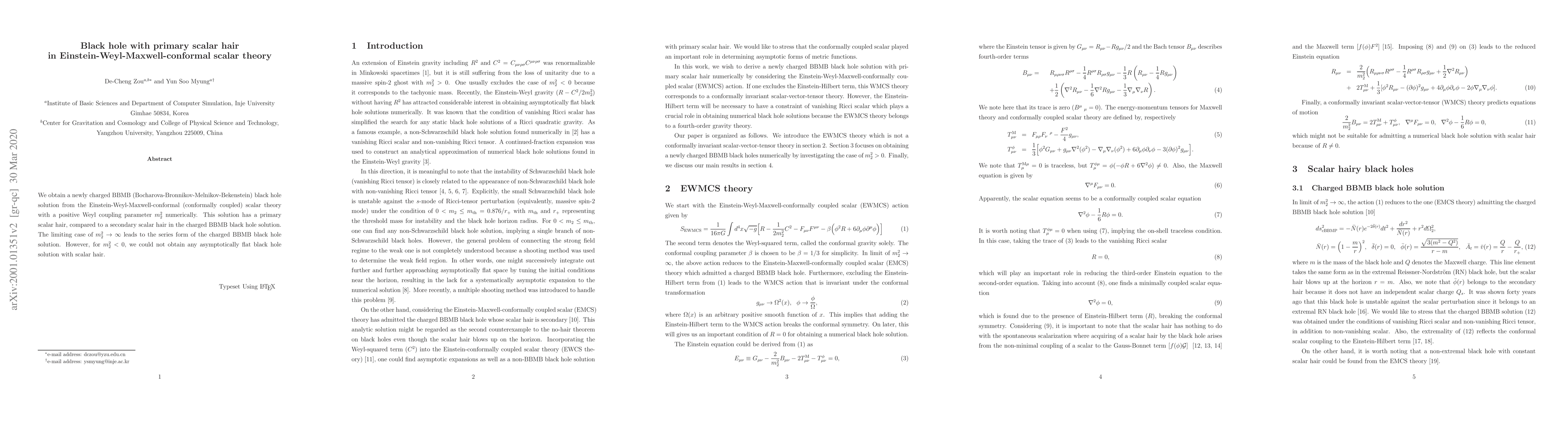 This paper presents a newly charged black hole solution with primary scalar hair derived from the Einstein-Weyl-Maxwell-conformal scalar theory. The solution contrasts with secondary scalar hair in previously known charged BBMB black holes, and the study finds no asymptotically flat black hole solutions with scalar hair for negative Weyl coupling parameters.