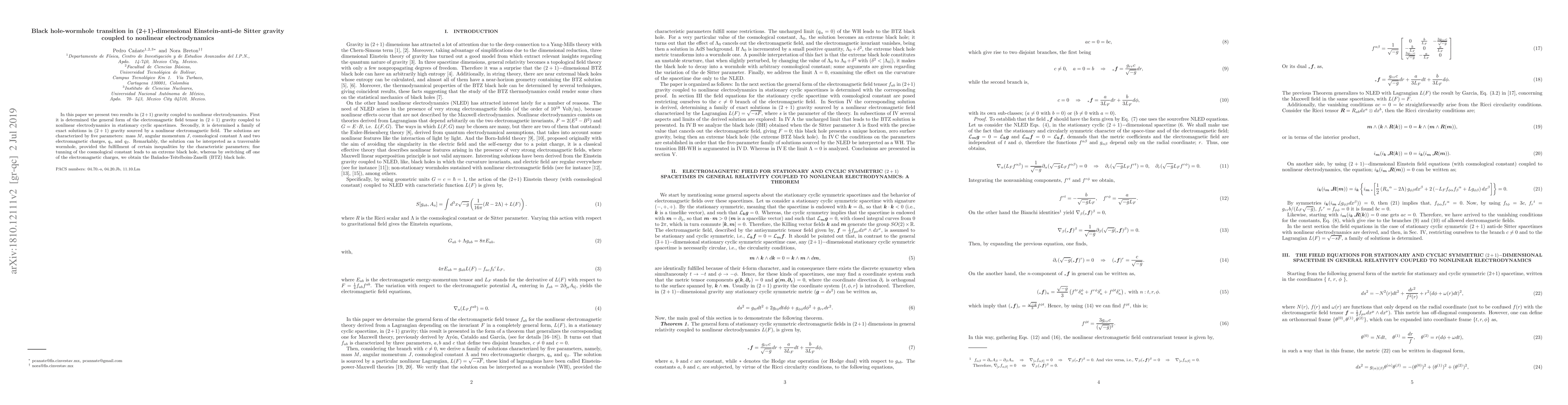 In this paper we present two results in $(2+1)$ gravity coupled to nonlinear electrodynamics. First it is determined the general form of the electromagnetic field tensor in $(2+1)$ gravity coupled to nonlinear electrodynamics in stationary cyclic spacetimes. Secondly, it is determined a family of exact solutions in $(2+1)$ gravity sourced by a nonlinear electromagnetic field. The solutions are characterized by five parameters: mass $M$, angular momentum $J$, cosmological constant $\Lambda$ and two electromagnetic charges, $q_{\alpha}$ and $q_{\beta}$. Remarkably, the solution can be interpreted as a traversable wormhole, provided the fulfillment of certain inequalities by the characteristic parameters; fine tunning of the cosmological constant leads to an extreme black hole, whereas by switching off one of the electromagnetic charges, we obtain the Ba\~nados-Teitelboim-Zanelli (BTZ) black hole.