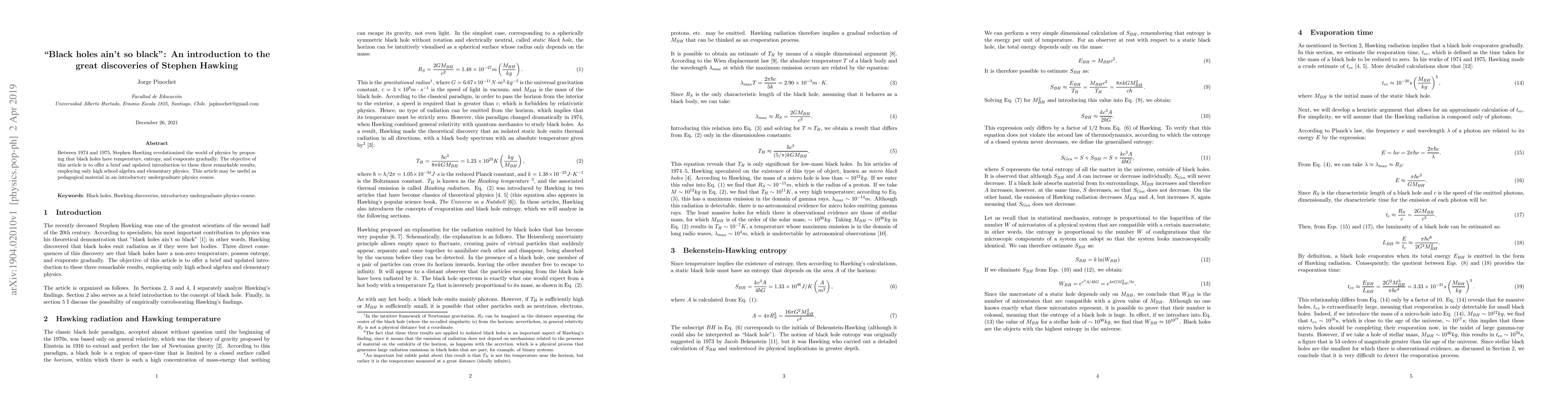 This paper introduces Stephen Hawking's groundbreaking discoveries on black holes, revealing they have temperature, entropy, and gradually evaporate, using only high school algebra and basic physics concepts. Aimed at undergraduate physics courses, it serves as accessible pedagogical material.
